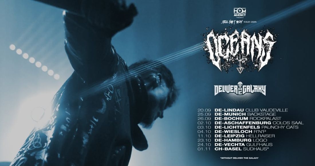 Im Herbst diesen Jahres gehen Oceans erstmals auf Headline-Tour. Die deutsche Band, die ihren Stil selbst als Nu Death Metal beschreibt, brachte letztes Jahr ihr 3. Studioalbum HAPPY raus und arbeitet derzeit an einem Nachfolger der EP We Are Nøt Økay. Anfang des Monats erschien daraus die erste Single Ghost. Mit all dem im Gepäck spielen Oceans im September und Oktober 10 Headlineshows in Deutschland und eine weitere in der Schweiz. Als Support im Gepäck haben sie Deliver The Galaxy.