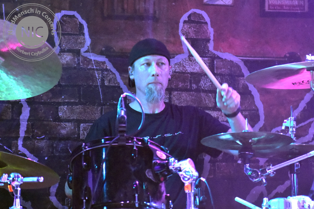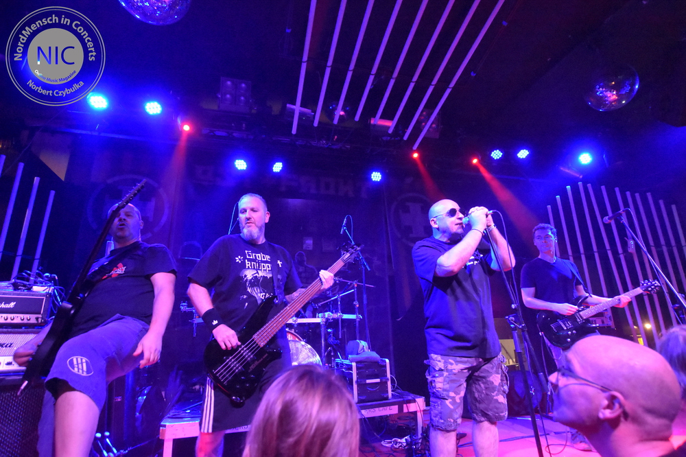 19:45 Uhr – Das Licht geht zum ersten Male am heutigen Abend für eine Band aus. Auf der Bühne stehen 68FL:OZ aus Lemgo/Lippe. Es ist ihr dritter Versuch, hier im Rider´s Cafe aufzutreten. Schafften es die bisherigen Kartenvorverkäufe nicht, das Konzert stattfinden zu lassen, haben sie jetzt im dritten Versuch ein ausverkauftes Haus. Als Ost+Front-Support dürfen sie fünfmal ran. Heute ist ihr Auftakt. Die Truppe spielt Deutschrock, der musikalische Stil erinnert an Rose Tattoo. Sänger Terry sieht nicht nur aus wie Angry, hat auch das entsprechende Tattoo auf dem Oberarm. Drummer Freddy ist erst seit zwei Monaten dabei. Die Truppe hatte in ihrer zehnjährigen Geschichte schon einige personelle Veränderungen. Songs wie „FCK das System GmbH“ oder „König ohne Thron“ sind eingängig, gefällig und bestimmen die politische Richtung. Mit dem Titel „Was Besonderes“ geben sie allerdings eine nicht geplante Zugabe, die den Zeitplan ins Wanken bringt. Nach 55 Minuten verlassen sie dann für einen kurzen Umbau die Bühne.