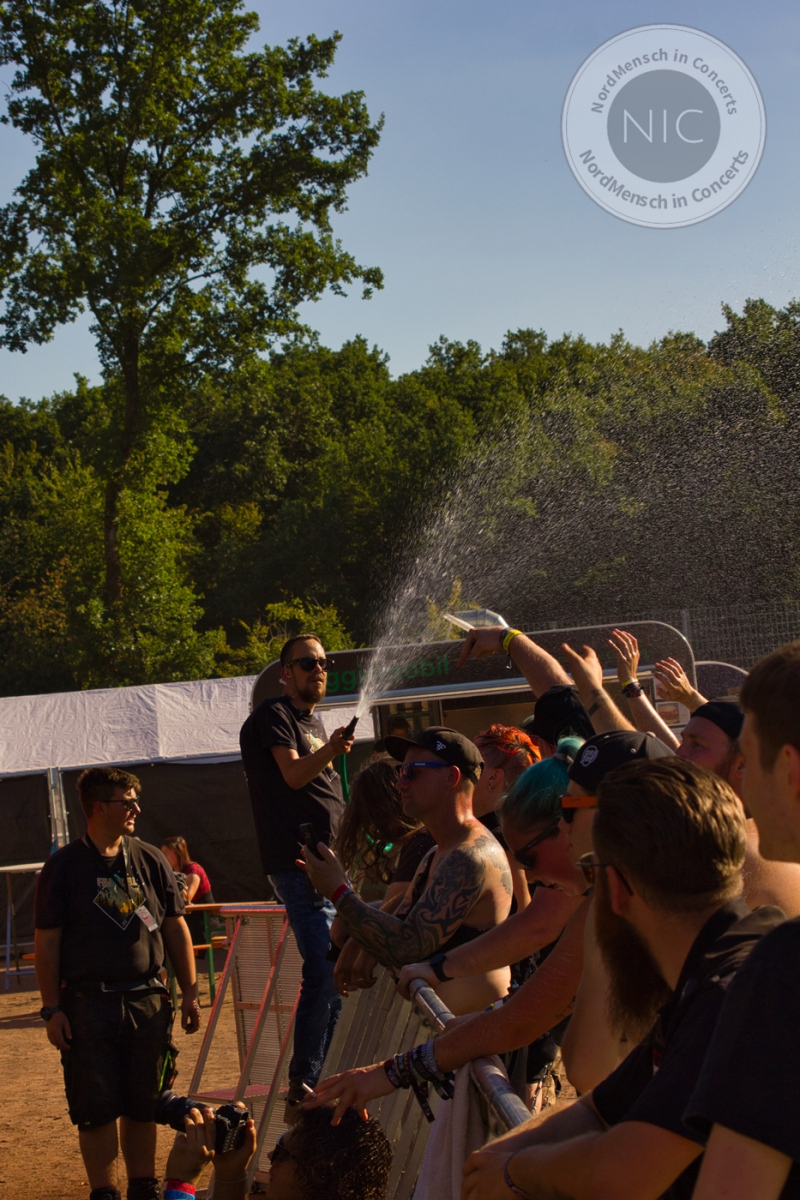 Diesmal fiel am Freitagmorgen um 9.00 Uhr der Startschuss und die wartende Meute stürmte den Zeltplatz. Bei meiner Ankunft gegen 10.15 Uhr war der erste Andrang bereits überwunden und so konnte man ohne Wartezeit direkt auf den Parkplatz. Einzig die kurzen Schwätzchen mit altbekannten Gesichtern an den Einlasskontrollen „kosteten ein wenig Zeit“. Nachdem das Auto geparkt war, folgte der kurze Fußmarsch von rund 200 Metern zum Campground und der man baute erst einmal gemütlich auf. Zeit für das erste Bier des Tages, das im Kreise der altbekannten Festivaltruppe natürlich umso mehr mundete. Kurz vor 16:00 Uhr bewegten wir uns im Kollektiv Richtung Infield. Vor der Bühne hatte sich schon eine beachtliche Menge an Besuchern eingefunden, um dem ersten Act des Tages die Ehre zu erweisen.