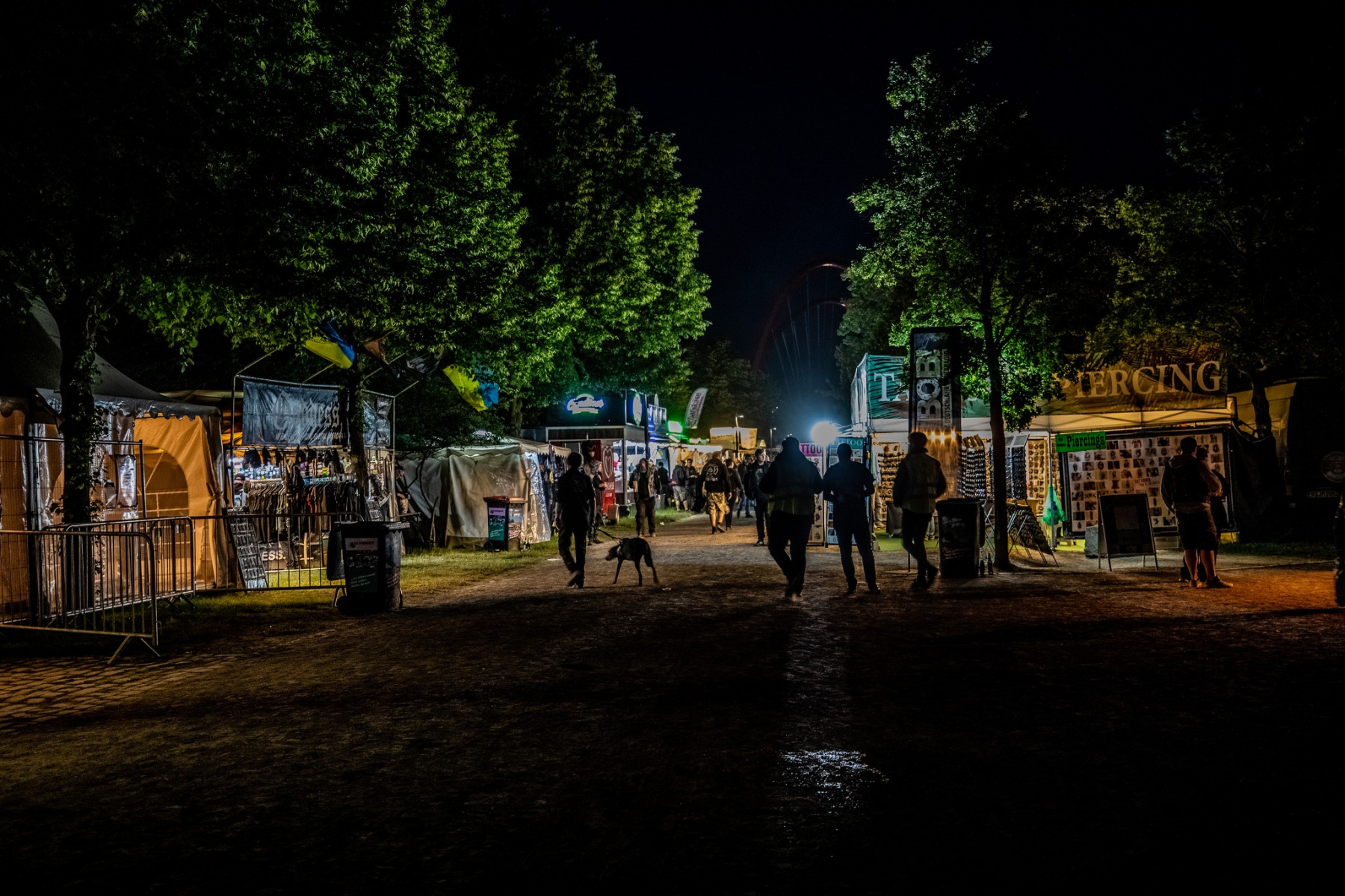 Der Einlass geht recht flott vonstatten. Auf dem eigentlichen Festivalgelände angekommen, findet man eine Meile im Rund, die alles bietet, was das Festivalherz begehrt. Merchstände, Kulinarisches in Hülle und Fülle, wie z.B. Asia Food, Hamburger, Bratwurst, Nackensteaks, Pommes, Reibekuchen, Crêpes, Pizza, Fischbrötchen, Döner und Bierstände. Des weiteren finden wir ein Zelt, in dem die „Painted in Blood“ Ausstellung der Künstler Björn Gooßes, Thomas Ewerhard und Jan Meininghaus zu bewundern ist. Und dann gibt es den Biergarten und eine kleine Party Stage, auf der abschließend noch vom DJ aufgelegt wird.