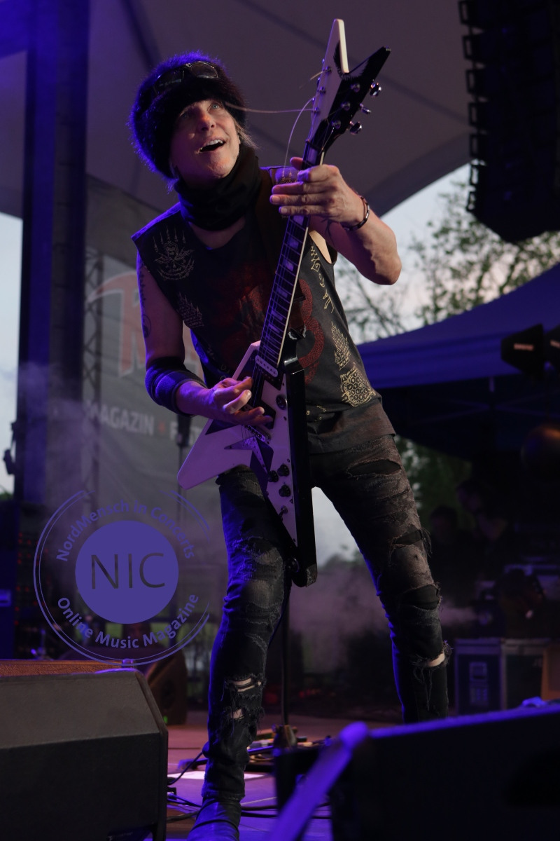Als Headliner des letzten Festivaltages kommt die MICHAEL SCHENKER GROUP. Am Mikro haben wir den gutaussehenden Ronnie Romero und seitlich – eher bescheiden im Hintergrund mit „warmer Mütze“ – spielt Meister Schenker seine Solis. Wir hören uns noch die ersten drei Songs an und verlassen nach dem UFO-Klassiker „Doctor Doctor“ langsam die Venue und treten den Rückweg zum Hotel an. Aufgrund des Pfingstrückreiseverkehrs wollen wir morgen ganz früh in den Norden fahren. Dieses „frühe Gehen“ macht sich auch in der Publikumszahl ein wenig bemerkbar, denn viele wandern zusammen mit uns ab. Dennoch – so hörten wir am Tag darauf – war der Auftritt von Michael Schenker und Bandmitgliedern großartig. Die Band hatte Bock und im Vergleich zum Headliner des Vortages war dieser Auftritt auch mit bestem Sound versehen.