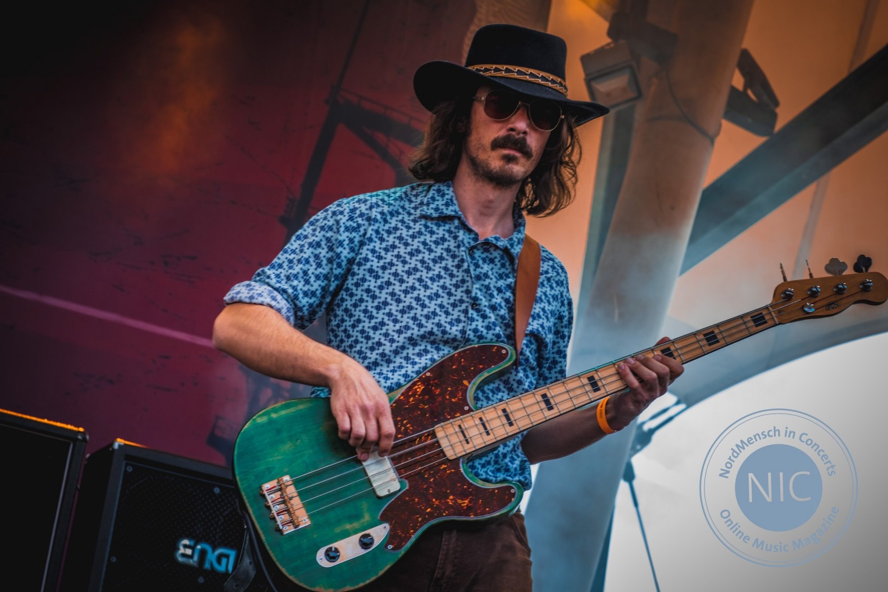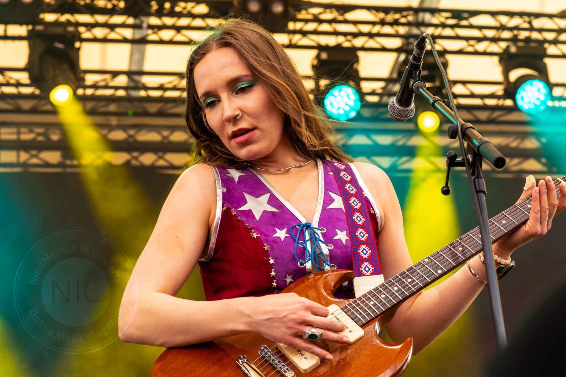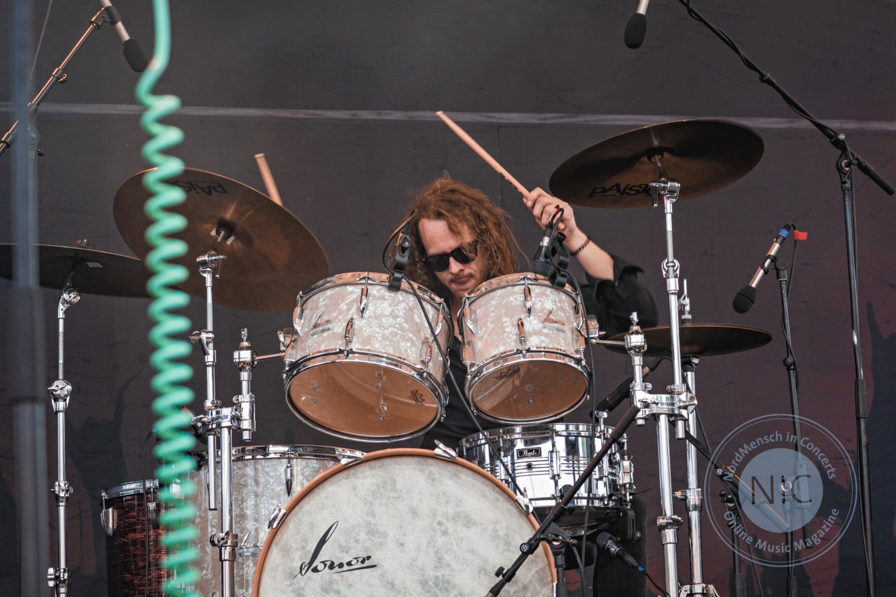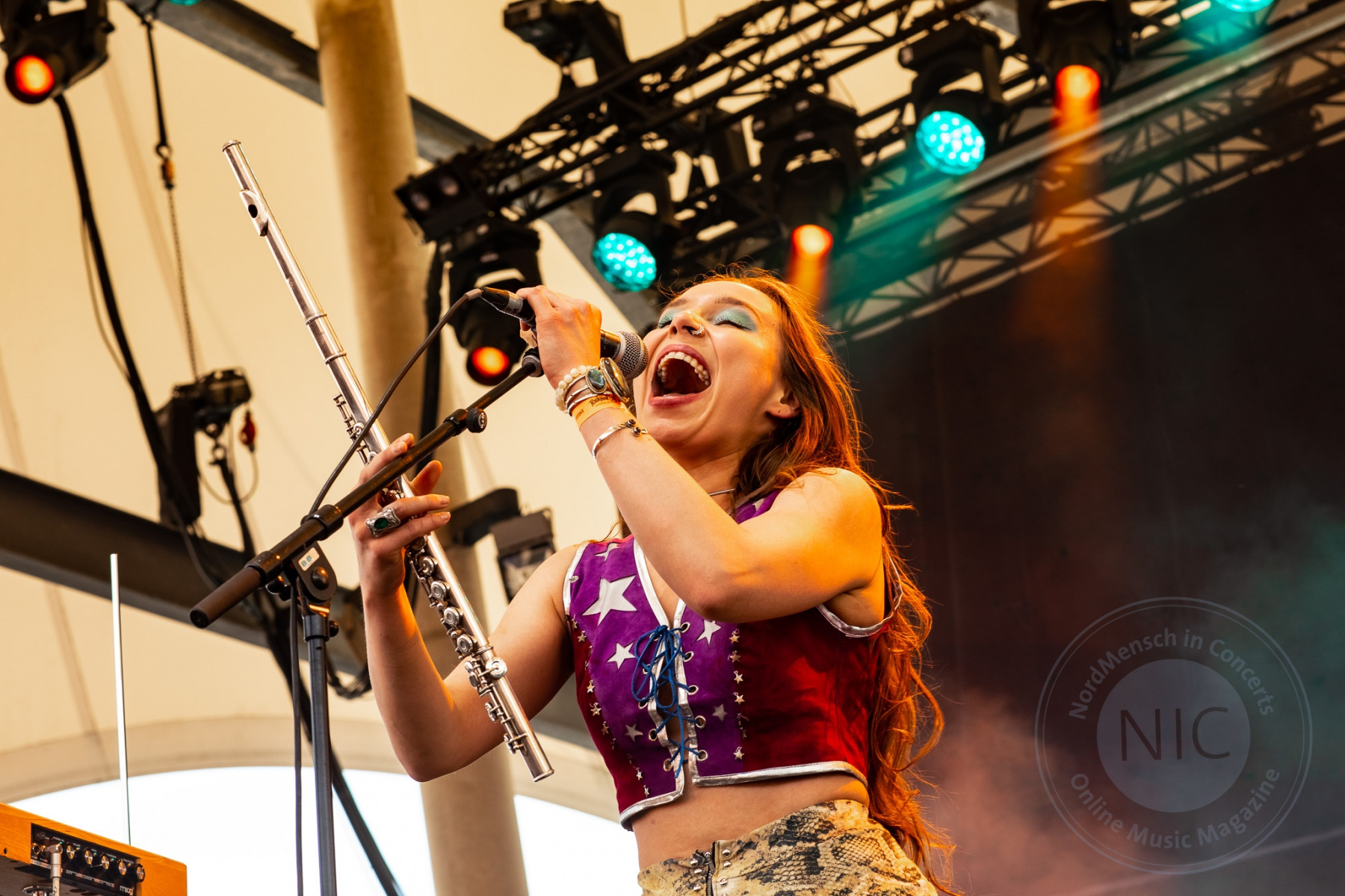14:10 Uhr – Zeit für WUCAN: Fronfrau Francis Tobolsky erscheint auf der Bühne – wie immer absolut sexy im Outfit. Sie versprüht solch eine Energie, schon allein mit ihrem Dasein – eine Wahnsinns-Attetude. Um sie herum gesellen sich im 70er Jahre-Dress nun auch Bass, Gitarre und Schlagzeug. Aus Dresden kommen sie, das kündigt Francis auch dem Publikum an und dann holt sie die Flöte heraus und ab geht die Luzie. Das komplette Set besteht aus Songs des aktuellen Albums „Heretic Tongues“. Gut 50 Minuten gibt es nun die volle Breitseite Rock, immer wieder untermalt mit psychedelischen Einflüssen, die gerade auch durch das Einsetzen des Theremins hervorgeholt werden. Neben dem Gesang spielt die sympatische Frontfrau Querflöte, Theremin und Gitarre. Der Spirit der Band überträgt sich in Windeseile auf das Publikum und es wird immer wieder am Rande getanzt. Wer WUCAN noch nicht live gesehen haben sollte – hingehen, anhören, anschauen und genießen.