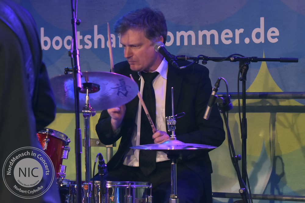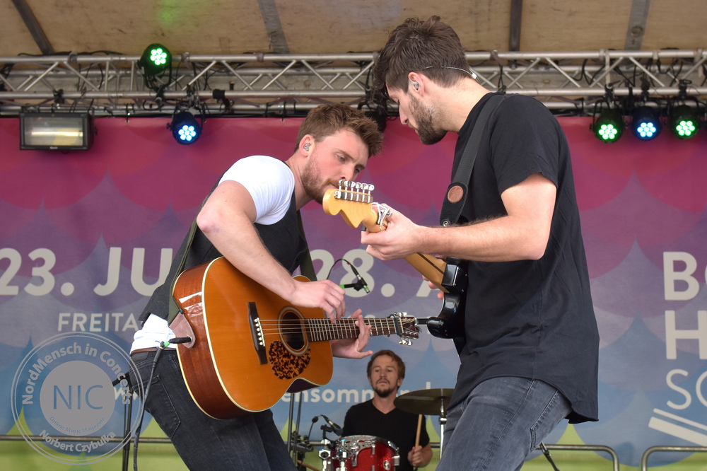 Wir kommen gerade pünktlich zu Fin Dawson aus Hamburg. Die junge Band überzeugt mit treibenden Rhythmen, rauer, kraftvoller Stimme und dynamischen Gitarrenriffs. Frontmann Marcus Lifke (Gesang und Gitarre), Torben Schnepp (Gitarre), Martin Kunst (Bass) und Matthias „Matze“ Petersen (Drums) spielen seit Ende 2018 eine solide Mischung aus Acoustic, Rock und Indie-Folk. Ihre kurz nach der Gründung veröffentlichte EP „First Impact“ war ein gelungener Aufschlag. Mit weiteren Ausrufezeichen wie einschlägigen Bandcontest-Erfolgen, haben die Jungs seitdem fleißig nachgelegt. Kein Wunder, denn die Hanseaten bleiben vor allem wegen ihrer Einzigartigkeit in Stimme und Sound im Gedächtnis. Ihr Ruf, eine Liveband zu sein, eilt ihnen voraus und diesen Anspruch bestätigen sie auch heute. Sie feiern ihre selbst geschriebenen Songs zusammen mit dem Kieler Publikum. Nach Aussage von Markus war der heutige Auftritt bereits der fünfte in Kiel und wieder ein voller Erfolg. Besonders Matze ist erwähnenswert. Einen singenden, Akkordeon spielenden Schlagzeuger habe ich bisher noch nicht gesehen. Von dieser Band wird man sicher noch einiges in Zukunft zu hören bekommen.