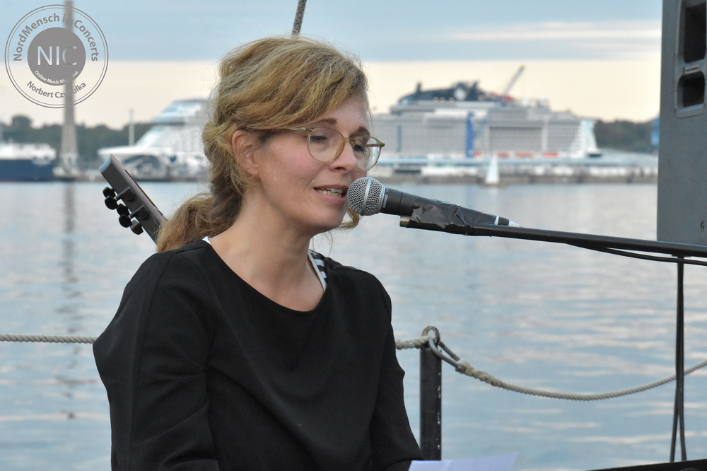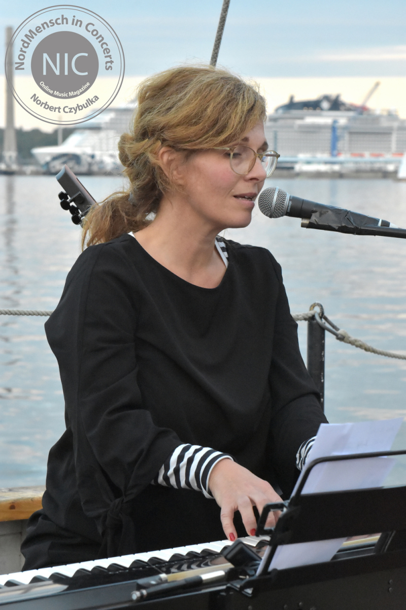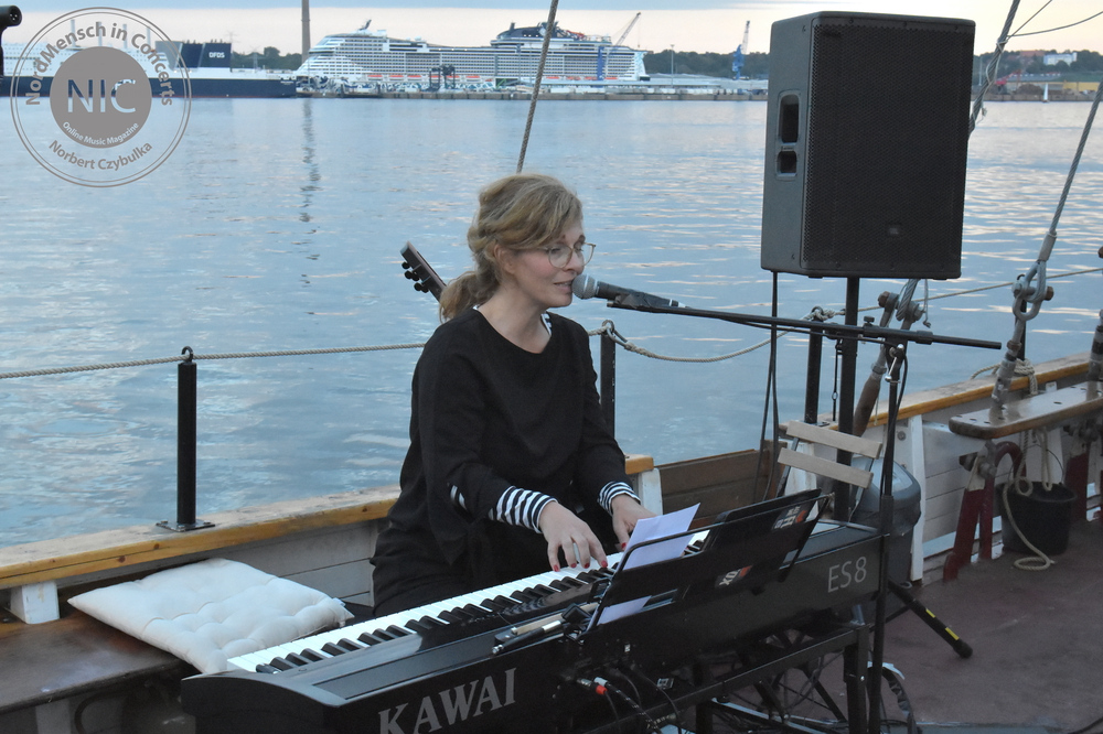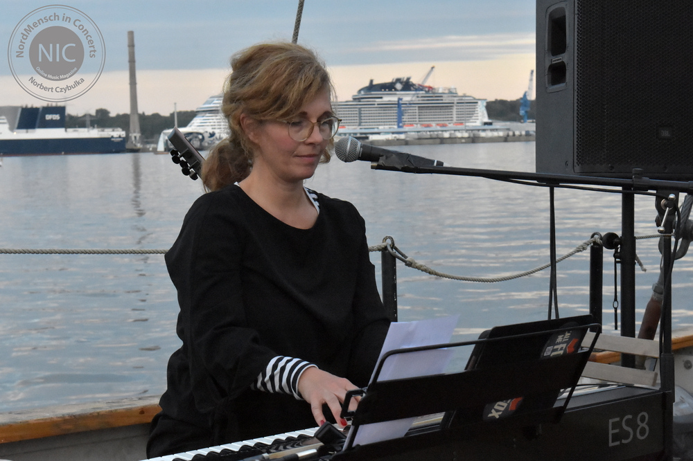 Es ist für Mitte September ungewöhnlich warm und … windstill! Das lädt einen umso mehr ein, an die Wasserlinie zu gehen und einen der letzten Sommertage mit Freunden zu genießen. Heute kommt nicht nur mein Freundeskreis aus Hamburg, sondern auch die Künstler auf die Freedom. Ab 19 Uhr steht auf dem Schiff Stefanie auf der Bühne. Nein, keine Bühne. Nur so an Deck. Und auch nicht Stefanie. „Sophie & der Sommer“ geht mit einem Solo-Programmgemisch aus Pop, Chanson und ein wenig Jazz an den Start. Die vielfältige Musikerin spielt sonst als Studiomusikerin oder unterstützt namhafte Bands wie Sylvan, The Lets, The Iron Lung Quintet und viele mehr. Sie sitzt am geliehenen Klavier und hat noch ein Mini-Keyboard, E-Cello, Loop und eine Konzertukulele mitgebracht. Nach ihrem Programm spielt sie noch einen Song mit Marek von DVN gemeinsam an (seinem) Klavier.