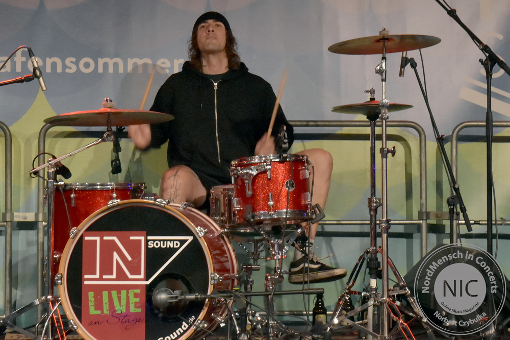 Auch die nächste Band kommt aus Hamburg. RUNNING WITH LIONS haben allerdings ihr Release schon heraus gebracht. Ihr Stil: Pop-Punk. Ihr Album: Die EP „The Scenic Route“. (Rezension hier!). Auch wenn die Release-Party von Sänger Eike, Bassistin Krissi, Gitarrist Gerrit und Drummer Marty immer wieder verschoben wurde, stehen ihre Songs heute neben einigem Neuen auf dem Programm. Neben dem Titeltrack kommen auch die anderen Songs der EP zu Gehör. „Decades“, „Self Respect“, „Standstill Protocoll“ und als letzten Song des Gigs „Dear Future Self“ kommen beim Kieler Publikum gut an. Mein Favorit am heutigen Tag ist allerdings „Closer“. Der Song feierte erst vor sechs Wochen sein Release als Videosingle. Bassistin Krissi schwimmt im Übrigen lieber mit Flamingos als mit Löwen zu laufen. Ihr Bier wurde vor dem vollen Hafenbecken sicher in einem passenden rosa Schwimmring in Sicherheit gebracht.