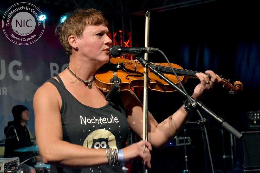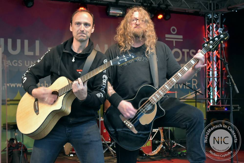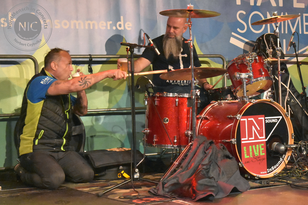Es herrscht auflagengemäß Tanzverbot. Die nächste Band allerdings, ist für die tanzbaren, schunkeligen Rockhymnen nicht nur hier in ihrer Heimatstadt Kiel bekannt. WOLF BARSCH betreten pünktlich zu einem 70minütigen Programm die Bühne. Ihre Songs handeln von der christlichen Seefahrt, Alkohol und Liebe. Und das alles bitte nicht allzu ernst nehmen! Auf Releases braucht man bei Wolf Barsch nicht einzugehen. Sie haben bisher nur 2017 die inzwischen legendäre „Sex And Drugs And Seemannsgarn“ CD heraus gebracht. Sänger Olaf Grobe verspricht dem Publikum nicht so viel wie sonst zu sabbeln. Ambitioniert haben sie 22 Songs auf der Setlist. Vorweg genommen: Beides hielt die Truppe nicht ein. Natürlich starten sie mit ihren Klassikern. „Wir lagen vor Madagaskar“ ist immer der Opener. „Der Fischer“ ist ein Cover von Kraftwerk im Rammstein-Stil. Das Original „Das Model“ bekommt hier allerdings einen neuen nordischen Text. Mit dem ersten Kapitän, jetzt auf Basis von Dolly Partons „Jolene“ enden die Coversongs und eigenes Material  soll die Kieler Fans unterhalten. Mit „Bärte“, „Scheißegal“, „Drei Schwestern“, „Matrosen“ und „Blauort“ folgen Songs der CD. Olaf verstrickt sich immer wieder in Klabautermann-Klönschnack, die Band bekommt von einem Gast passend zu „Hebt das Glas, Matrosen“ eine Lage Schnaps ausgegeben. Die Setlist muss gekürzt werden, die Zeit langt nicht mehr. Nach dem Klassiker „Martina Navratilova“ geht es mit brandneuen Songs weiter. Einige Verspieler begleiten die neuen Songs. Obwohl es nun auch noch angefangen hat zu regnen, ist hier niemand böse drum. Mit dem „Kapitän“ von Lennart Cohen beschließen sie den Partyabend als Zugabe fehlerfrei. Maschine bringt seinem „Das Beben“-Bandkollegen Sascha Werner noch kurz ein Fassbier ans Schlagzeug; damit Sascha es auch trinken kann, übernimmt Maschine einen Stick und sie spielen weiter als Duo.