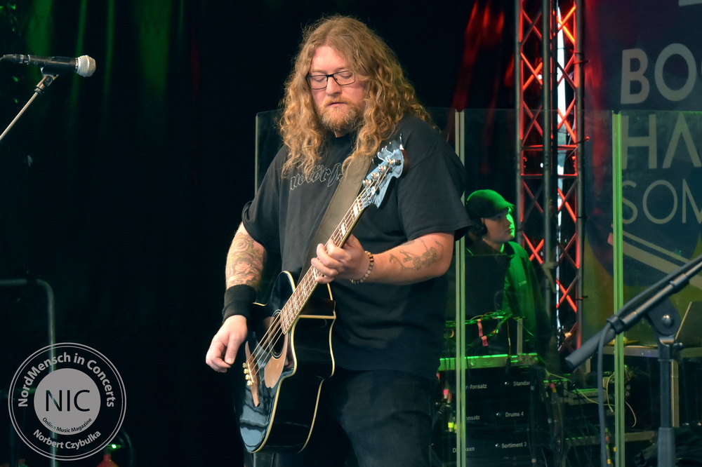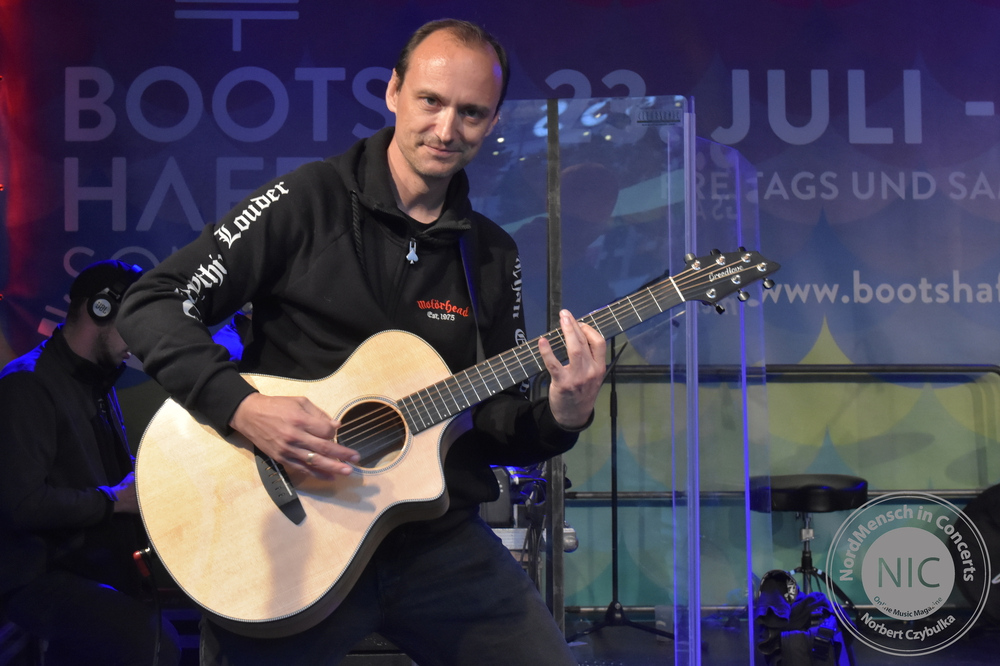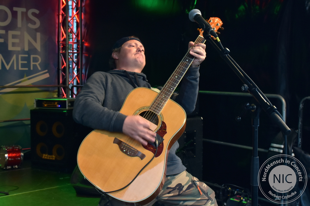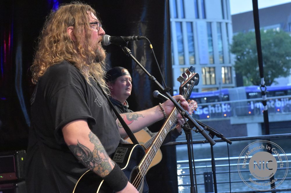 Wer meint, Metal muss laut, wird jetzt beim nächsten Act eines Besseren belehrt. IRON MIC sind eigentlich Kiels überregional bekannte Melodic-Thrash-Metal-Band Tyson, die sich selbst als Akustikband covern. Traten sie bisher immer als Trio in verschiedenen Besetzungen auf, stehen heute vier Tysons auf der schwimmenden Bühne des Bootshafens. Normalerweise spielten sie in der Besetzung mit André „Kochi“ Koch am Bass, Pierre Dapper an der Gitarre und Oliver Teschner, Tysons Ur-Drummer, am Schlagzeug. Heute jedoch spielt auch der zweite Gitarrist Torsten Ziemann mit.