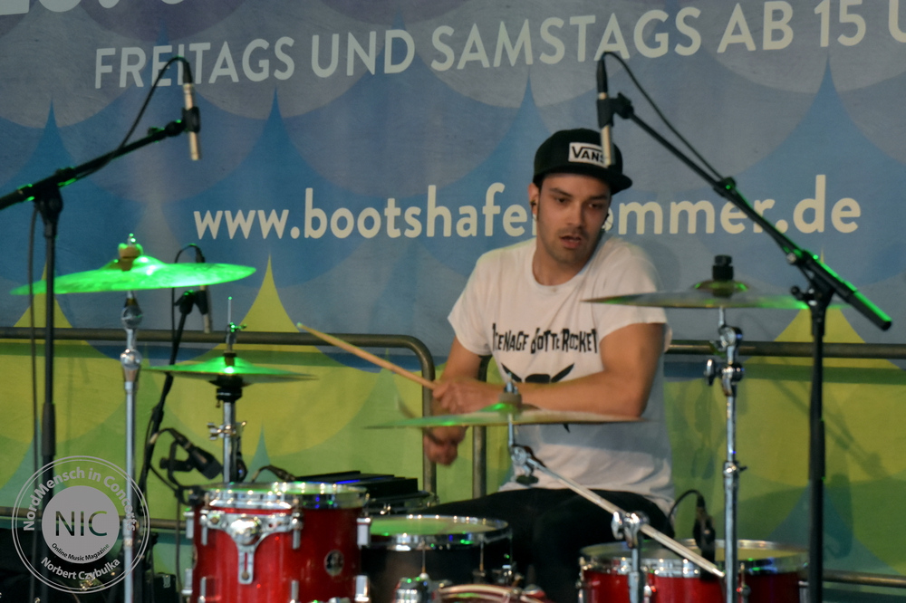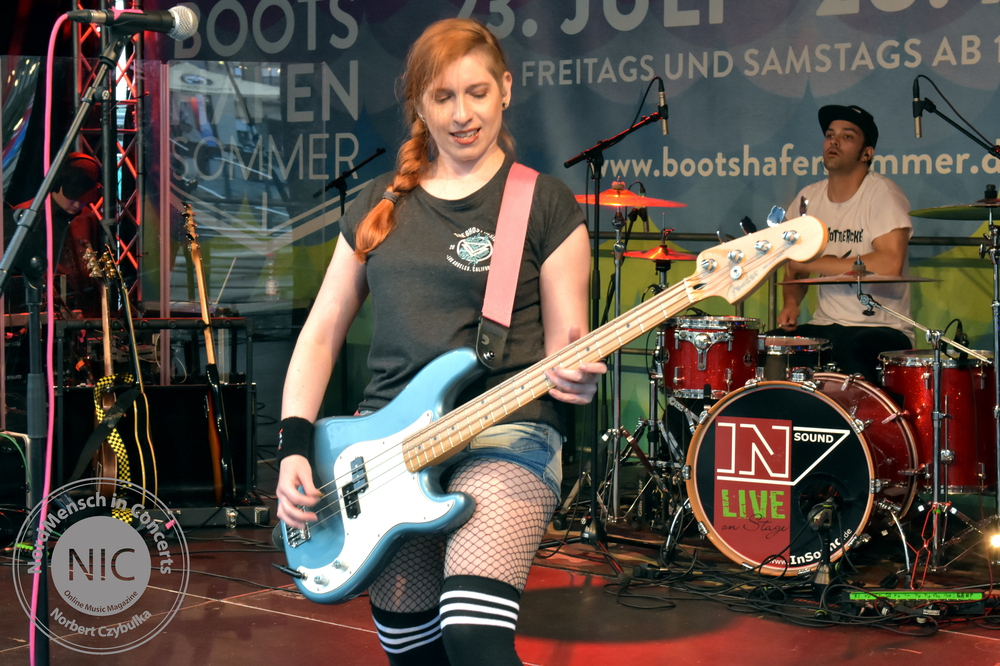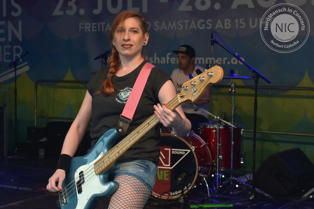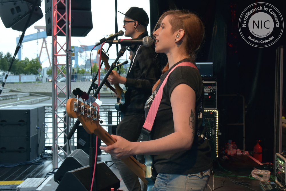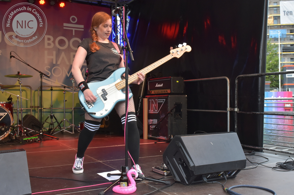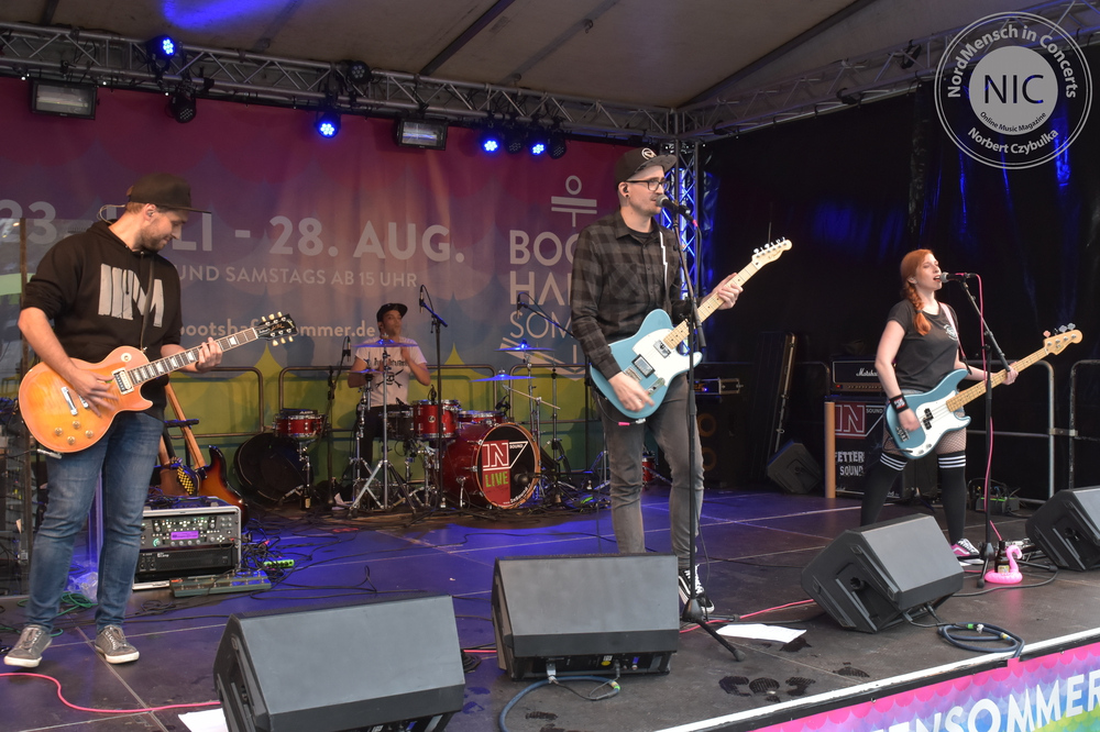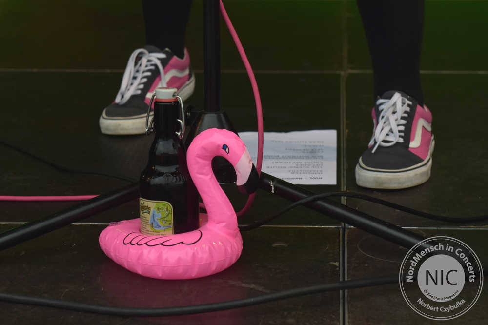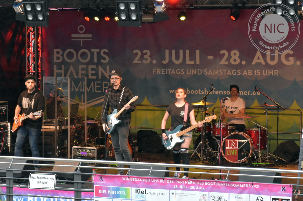 Auch die nächste Band kommt aus Hamburg. RUNNING WITH LIONS haben allerdings ihr Release schon heraus gebracht. Ihr Stil: Pop-Punk. Ihr Album: Die EP „The Scenic Route“. (Rezension hier!). Auch wenn die Release-Party von Sänger Eike, Bassistin Krissi, Gitarrist Gerrit und Drummer Marty immer wieder verschoben wurde, stehen ihre Songs heute neben einigem Neuen auf dem Programm. Neben dem Titeltrack kommen auch die anderen Songs der EP zu Gehör. „Decades“, „Self Respect“, „Standstill Protocoll“ und als letzten Song des Gigs „Dear Future Self“ kommen beim Kieler Publikum gut an. Mein Favorit am heutigen Tag ist allerdings „Closer“. Der Song feierte erst vor sechs Wochen sein Release als Videosingle. Bassistin Krissi schwimmt im Übrigen lieber mit Flamingos als mit Löwen zu laufen. Ihr Bier wurde vor dem vollen Hafenbecken sicher in einem passenden rosa Schwimmring in Sicherheit gebracht.
