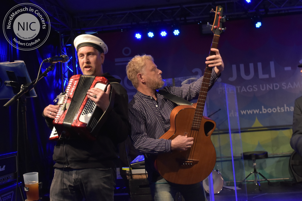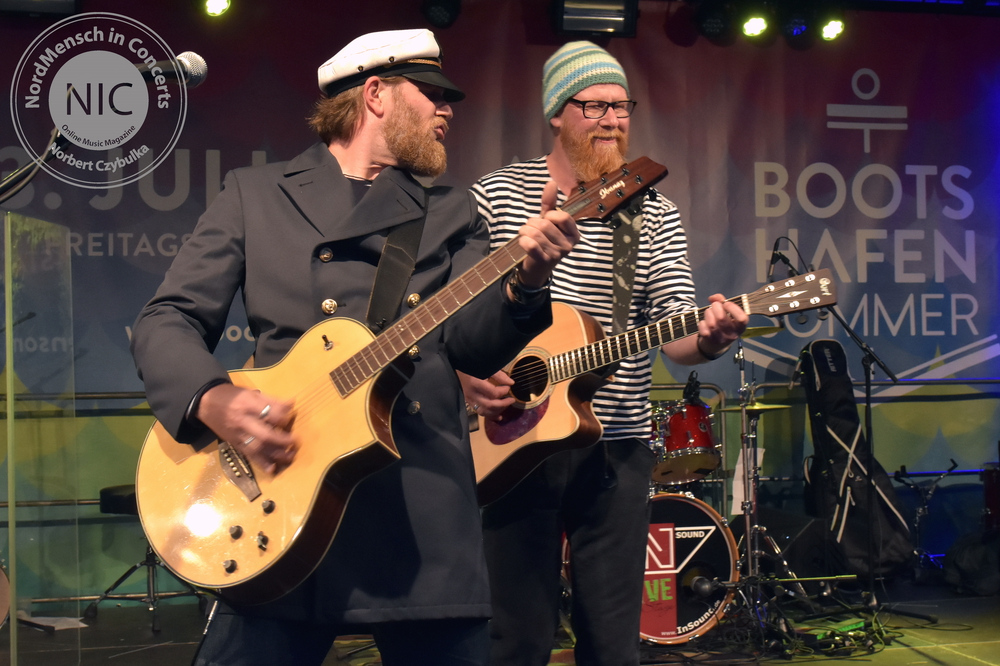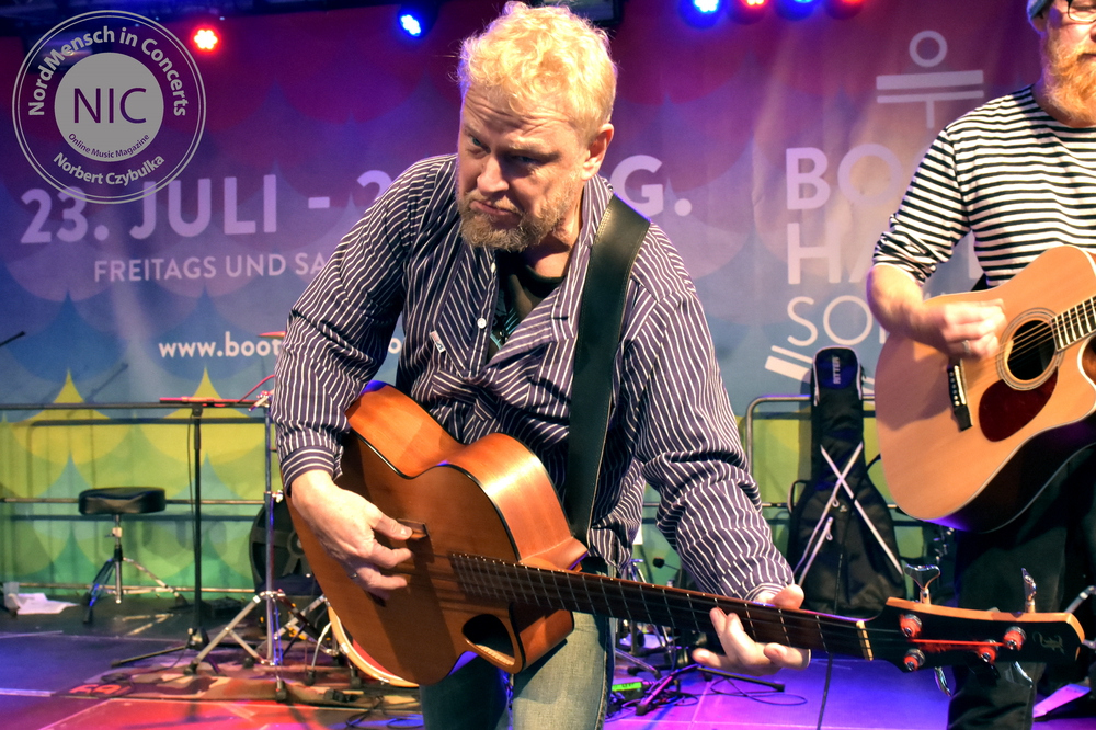 Wer meint, Metal muss laut, wird jetzt beim nächsten Act eines Besseren belehrt. IRON MIC sind eigentlich Kiels überregional bekannte Melodic-Thrash-Metal-Band Tyson, die sich selbst als Akustikband covern. Traten sie bisher immer als Trio in verschiedenen Besetzungen auf, stehen heute vier Tysons auf der schwimmenden Bühne des Bootshafens. Normalerweise spielten sie in der Besetzung mit André „Kochi“ Koch am Bass, Pierre Dapper an der Gitarre und Oliver Teschner, Tysons Ur-Drummer, am Schlagzeug. Heute jedoch spielt auch der zweite Gitarrist Torsten Ziemann mit.