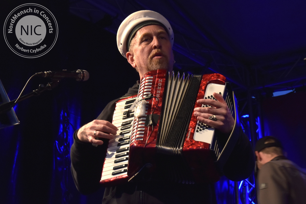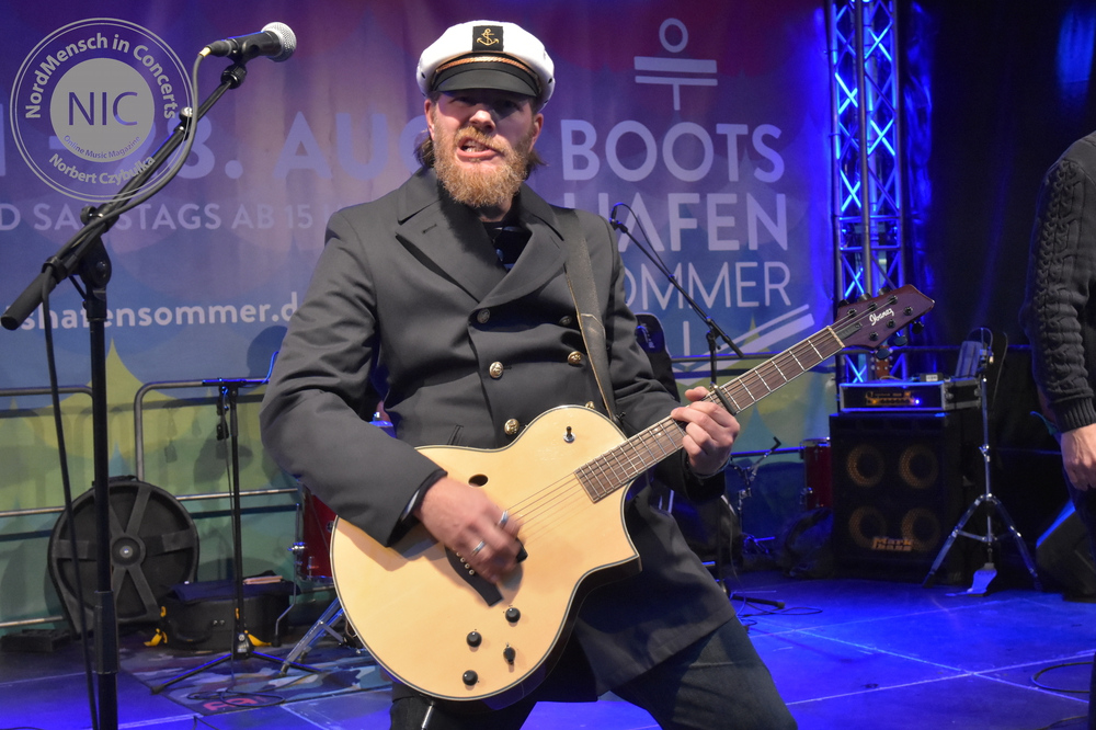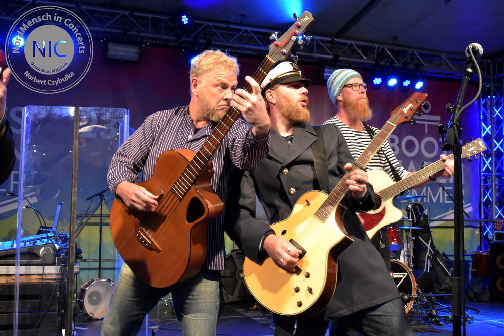 Es herrscht auflagengemäß Tanzverbot. Die nächste Band allerdings, ist für die tanzbaren, schunkeligen Rockhymnen nicht nur hier in ihrer Heimatstadt Kiel bekannt. WOLF BARSCH betreten pünktlich zu einem 70minütigen Programm die Bühne. Ihre Songs handeln von der christlichen Seefahrt, Alkohol und Liebe. Und das alles bitte nicht allzu ernst nehmen! Auf Releases braucht man bei Wolf Barsch nicht einzugehen. Sie haben bisher nur 2017 die inzwischen legendäre „Sex And Drugs And Seemannsgarn“ CD heraus gebracht. Sänger Olaf Grobe verspricht dem Publikum nicht so viel wie sonst zu sabbeln. Ambitioniert haben sie 22 Songs auf der Setlist. Vorweg genommen: Beides hielt die Truppe nicht ein. Natürlich starten sie mit ihren Klassikern. „Wir lagen vor Madagaskar“ ist immer der Opener. „Der Fischer“ ist ein Cover von Kraftwerk im Rammstein-Stil. Das Original „Das Model“ bekommt hier allerdings einen neuen nordischen Text. Mit dem ersten Kapitän, jetzt auf Basis von Dolly Partons „Jolene“ enden die Coversongs und eigenes Material soll die Kieler Fans unterhalten. Mit „Bärte“, „Scheißegal“, „Drei Schwestern“, „Matrosen“ und „Blauort“ folgen Songs der CD. Olaf verstrickt sich immer wieder in Klabautermann-Klönschnack, die Band bekommt von einem Gast passend zu „Hebt das Glas, Matrosen“ eine Lage Schnaps ausgegeben. Die Setlist muss gekürzt werden, die Zeit langt nicht mehr. Nach dem Klassiker „Martina Navratilova“ geht es mit brandneuen Songs weiter. Einige Verspieler begleiten die neuen Songs. Obwohl es nun auch noch angefangen hat zu regnen, ist hier niemand böse drum. Mit dem „Kapitän“ von Lennart Cohen beschließen sie den Partyabend als Zugabe fehlerfrei. Maschine bringt seinem „Das Beben“-Bandkollegen Sascha Werner noch kurz ein Fassbier ans Schlagzeug; damit Sascha es auch trinken kann, übernimmt Maschine einen Stick und sie spielen weiter als Duo.