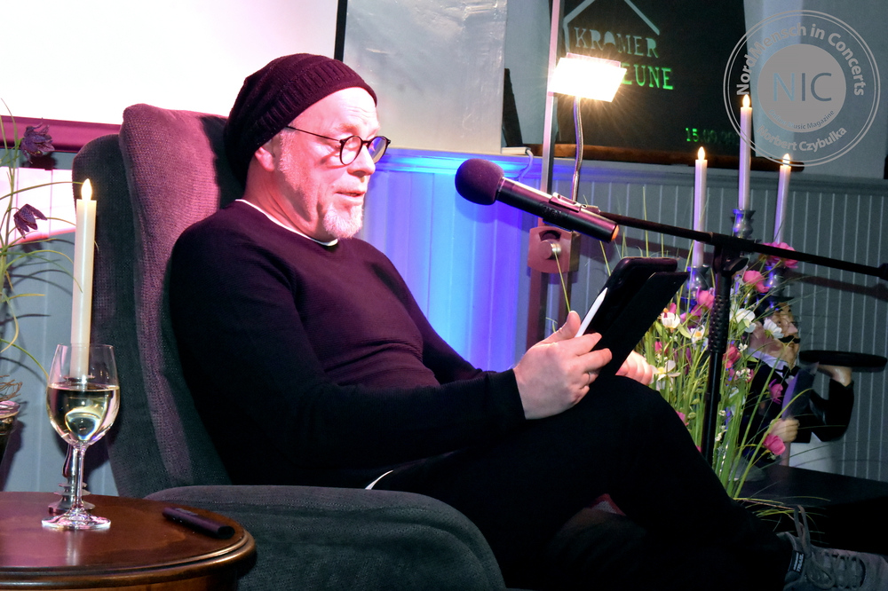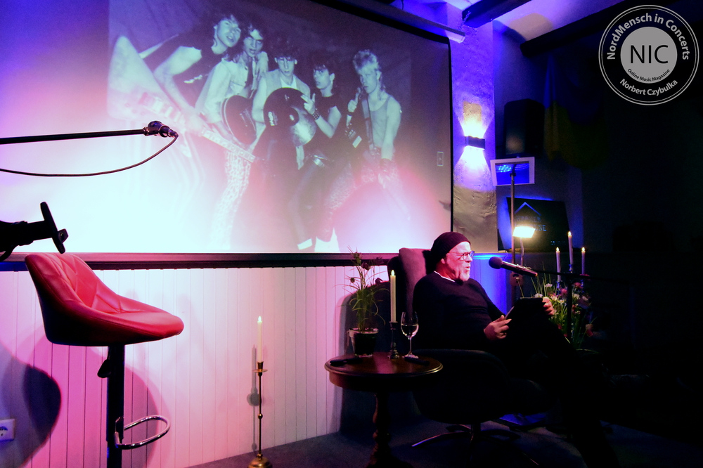 Das nun erschienene Hörbuch ist das Audioergebnis seines Buches, das im März bereits in die dritte Auflage geht. Bücher, eBook und Hörbuch bringt er im Self-Publishing heraus. Heute also eine Lesung daraus in der ausverkauften Nortorfer Kramer Scheune. Bei einem Eintrittspreis von 19,00 Euro waren die Tickets schnell vergriffen, denn nur etwas über 60 Personen passen hinein. Die Scheune ist voll bestuhlt, ein Tresenteam sorgt für das leibliche Wohl zu volkstümlichen Preisen. Die heutige Lesung mischt der Ausnahmemusiker mit Songs aus seiner eigenen Feder. Eine Gitarre und ein Mikrofon, mehr braucht es dazu nicht. Zu den gelesenen Texten aus einem gemütlichen Sessel heraus, wirft er die passenden Fotos aus der Zeit an die Wand im Hintergrund. Er erzählt komische, wahre und manchmal wirklich absurde Geschichten. „Disteln Am Arsch Der Hölle“, eine Umschreibung für die Volkspolizisten der ehemaligen DDR, sind aber im Buch nur eine stets presente Randerscheinung. Zweieinhalb Stunden lässt Sven uns an seinem Werdegang in der DDR teilhaben. Die für einen Aussenstehenden wirklich lustigen Geschichten bringt er heute jedoch nicht. Die bleiben dem Leser oder Hörer des Buches vorbehalten. Diese sind manchmal so krass, dass man die Geschichten nicht in der Öffentlichkeit konsumieren sollte. Ich habe mehrfach spontan laut aufgelacht. Skurrile Dinge, die unter anderem auch der Mangelwirtschaft der DDR geschuldet waren. Aber ich möchte natürlich nicht zu viel verraten.