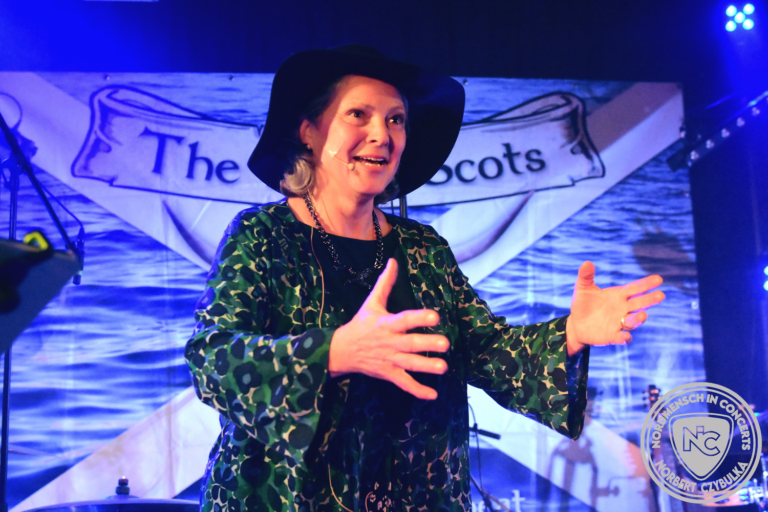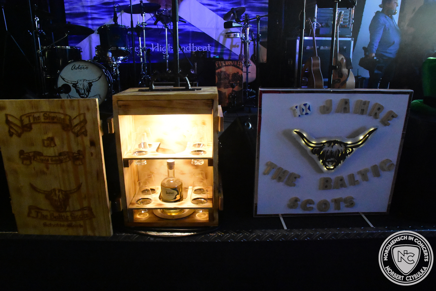 Der Partystart verzögert sich eine Viertelstunde. 18:45 Uhr geht es dann auf der Bühne los. Vor der Bühne steht wie immer der „Shrine of Liquid Sunshine“. Zum Jubiläum ein neues Exemplar, den ein Freund und Fan aus Flensburg gebaut hat. Mit Moderation wird durch den Abend geführt. Die Scots haben sich für den heutigen Abend eine besondere Setlist ausgedacht. Aufgeteilt auf vier Sets, beginnen sie mit drei Songs ihres 2017 erschienenen, preisgekrönten Debütalbums „Tscha“. In der Pause erzählte Katharina Götz eine der Geschichten, mit der sie bei der Veranstaltungsserie „Eine Schottische Nacht“ zusammen mit den Baltic Scots auftritt.