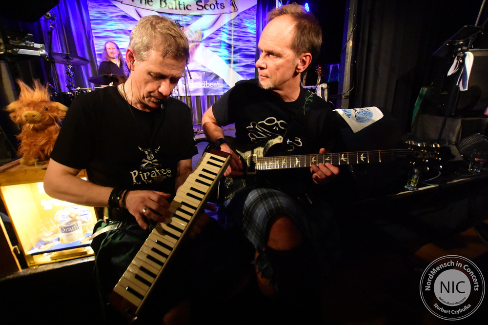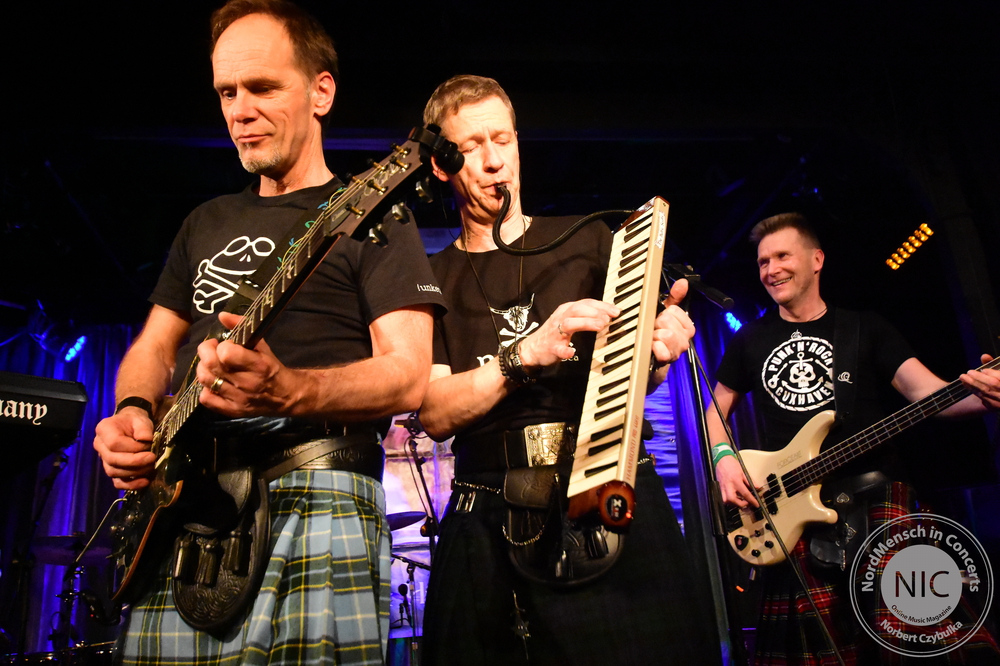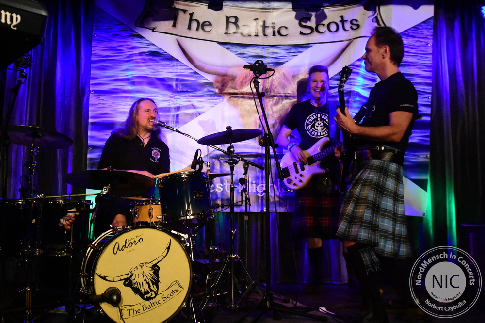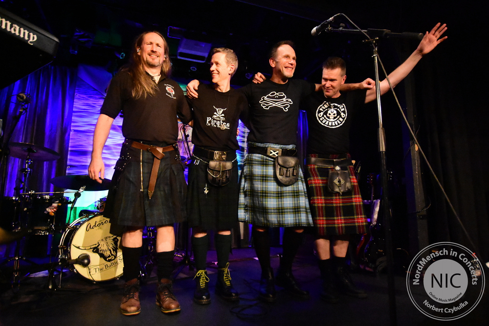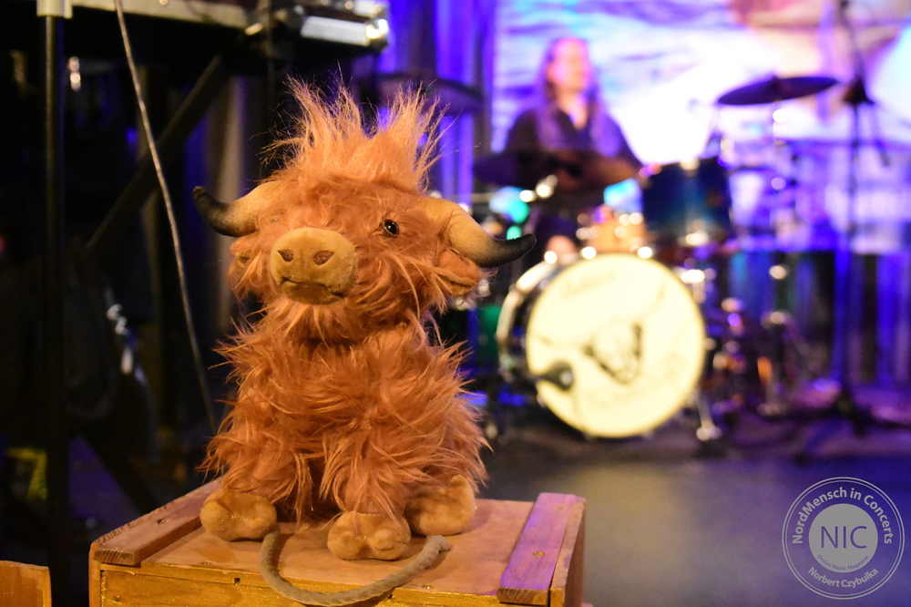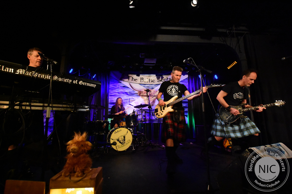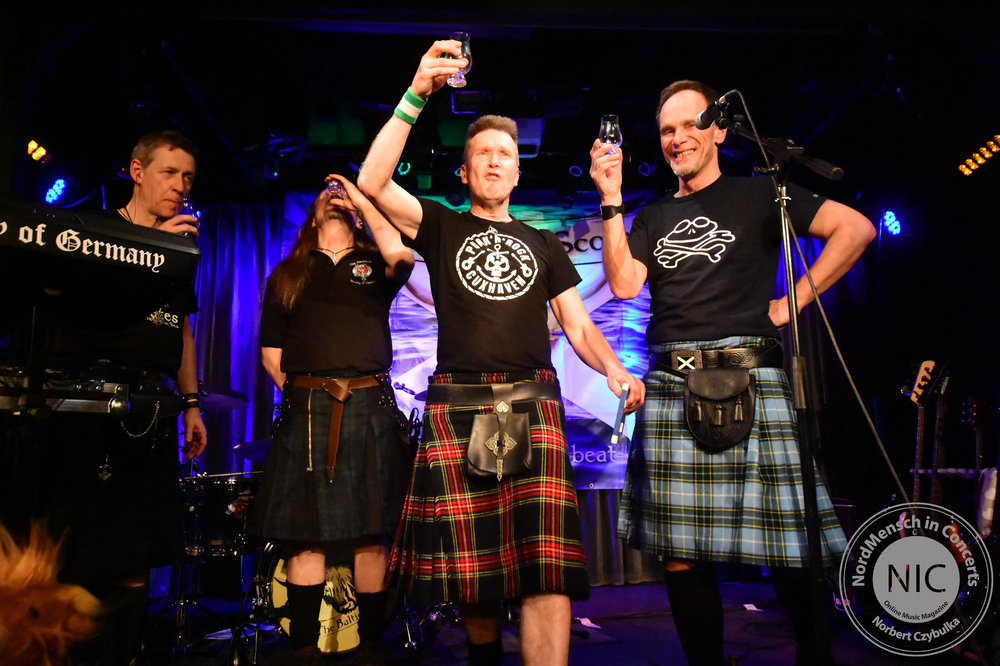 The Baltic Scots, das sind „Die vier gestandenen SchottenRock-Urgesteine von der Ostsee“, wie sie sich selbst vorstellen: Stefan „McBass“ Hensch (Bass und Gesang); Rolf „McLordOfTheKeys“ Seegen (Keyboard, Gesang); Falk „McHawk“ Langfeldt (Schlagzeug, Gesang) und Michael „McGuitar“ Götz (Gitarre, Gesang). Dazu kommt noch ein Highland-Rind als Maskottchen auf der Bühne, dessen Name ich leider vergessen habe. Zumindest bewacht es den Schrein mit dem flüssigen Sonnenlicht sehr gut. Ihre Musik ist Rockmusik im Stile irgendwo zwischen ihren schottischen Vorbildern Runrig und den irischen Pogues. So beginnen sie auch mit einem Runrig-Cover, um dann ein über 60 Minuten dauerndes Set mit eigenen Songs zu spielen. Eine 20minütige Pause gibt den Gästen die Chance die üblichen Sachen zu erledigen. Was folgt, ist eine Dopplung des bisherigen Abends. Weitere 60 Minuten beste Rockmusik plus dreier Zugaben lassen keinen Zweifel daran, dass heute jeder auf seine Kosten gekommen ist. Bei einem Set von 32 Songs muss natürlich zwischendurch die Stimme geölt werden. Hier kommt der Schrein mit dem flüssigen Sonnenlicht ins Spiel. Mit dem gälischen Trinkspruch „Sláinte mhath“ werden die Kehlen mit einem moorigen schottischen Whiskey geölt, bevor es weiter geht. „slaan-dsche-wah“ gesprochen, wünscht man dem Gegenüber gute Gesundheit. Aber auch die Bitte zum Umweltschutz kommt bei allen Gästen an. Der Schutz der Ostsee und des Wassers überall wird humorvoll gefordert, denn daraus wird Whiskey und Bier gemacht. Der passend dazu folgende Song „Lady Whiskey“ wurde dann von Schlagzeuger Falk gesungen. Auch im zweiten Set wird er noch zwei Songs vortragen. Im Set Nr. 2 ist es „Pirates Of The Baltic Sea“ sowie im Zugabenblock „Streams Of Whiskey“, ein Cover der Pogues zu Ehren des kürzlich verstorbenen Sängers Shane MacGowan. Sonst wirkt er oft Unterfordert und macht an seinen Drums auffordernde Gesten. Ihm scheint das alles zu langsam zu gehen.
