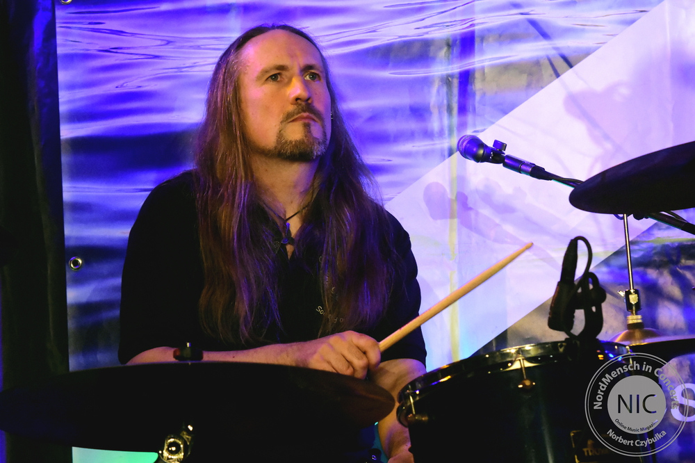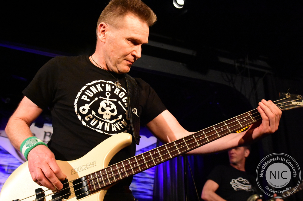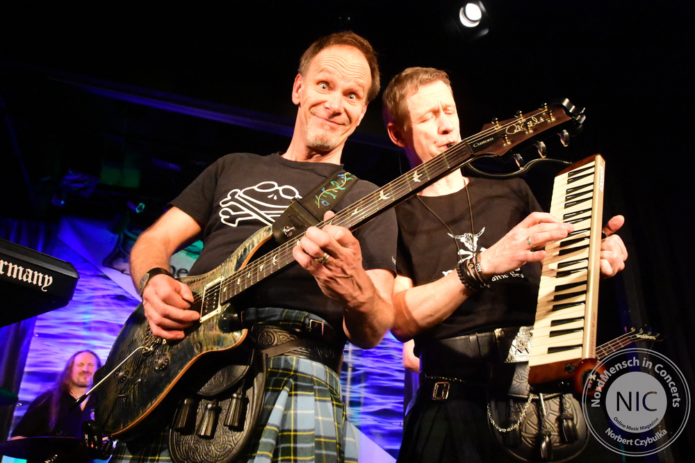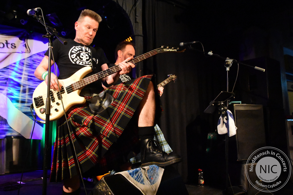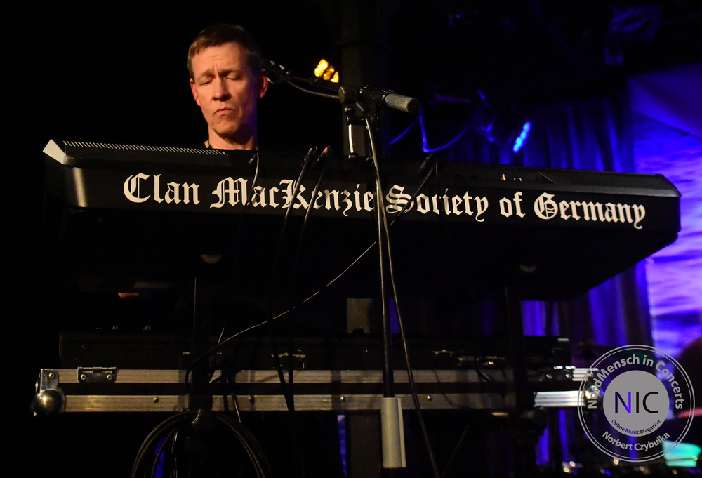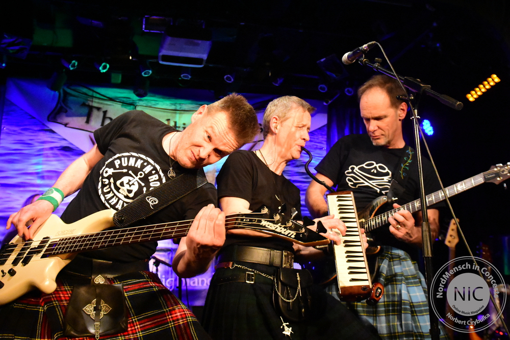 The Baltic Scots, das sind „Die vier gestandenen SchottenRock-Urgesteine von der Ostsee“, wie sie sich selbst vorstellen: Stefan „McBass“ Hensch (Bass und Gesang); Rolf „McLordOfTheKeys“ Seegen (Keyboard, Gesang); Falk „McHawk“ Langfeldt (Schlagzeug, Gesang) und Michael „McGuitar“ Götz (Gitarre, Gesang). Dazu kommt noch ein Highland-Rind als Maskottchen auf der Bühne, dessen Name ich leider vergessen habe. Zumindest bewacht es den Schrein mit dem flüssigen Sonnenlicht sehr gut. Ihre Musik ist Rockmusik im Stile irgendwo zwischen ihren schottischen Vorbildern Runrig und den irischen Pogues. So beginnen sie auch mit einem Runrig-Cover, um dann ein über 60 Minuten dauerndes Set mit eigenen Songs zu spielen. Eine 20minütige Pause gibt den Gästen die Chance die üblichen Sachen zu erledigen. Was folgt, ist eine Dopplung des bisherigen Abends. Weitere 60 Minuten beste Rockmusik plus dreier Zugaben lassen keinen Zweifel daran, dass heute jeder auf seine Kosten gekommen ist. Bei einem Set von 32 Songs muss natürlich zwischendurch die Stimme geölt werden. Hier kommt der Schrein mit dem flüssigen Sonnenlicht ins Spiel. Mit dem gälischen Trinkspruch „Sláinte mhath“ werden die Kehlen mit einem moorigen schottischen Whiskey geölt, bevor es weiter geht. „slaan-dsche-wah“ gesprochen, wünscht man dem Gegenüber gute Gesundheit. Aber auch die Bitte zum Umweltschutz kommt bei allen Gästen an. Der Schutz der Ostsee und des Wassers überall wird humorvoll gefordert, denn daraus wird Whiskey und Bier gemacht. Der passend dazu folgende Song „Lady Whiskey“ wurde dann von Schlagzeuger Falk gesungen. Auch im zweiten Set wird er noch zwei Songs vortragen. Im Set Nr. 2 ist es „Pirates Of The Baltic Sea“ sowie im Zugabenblock „Streams Of Whiskey“, ein Cover der Pogues zu Ehren des kürzlich verstorbenen Sängers Shane MacGowan. Sonst wirkt er oft Unterfordert und macht an seinen Drums auffordernde Gesten. Ihm scheint das alles zu langsam zu gehen.