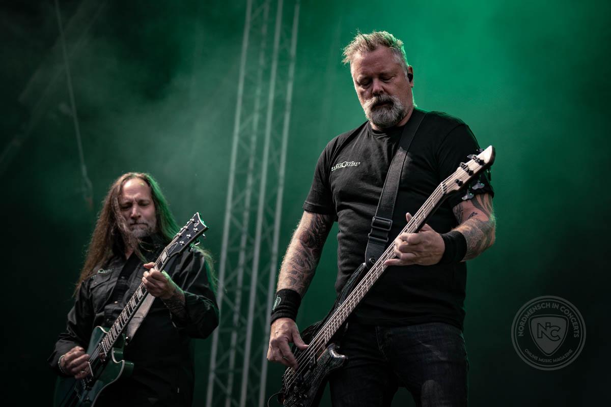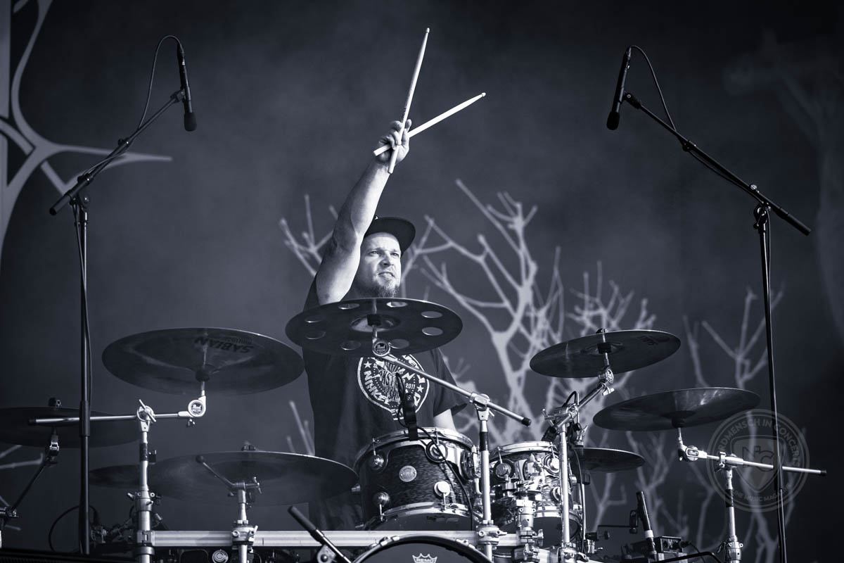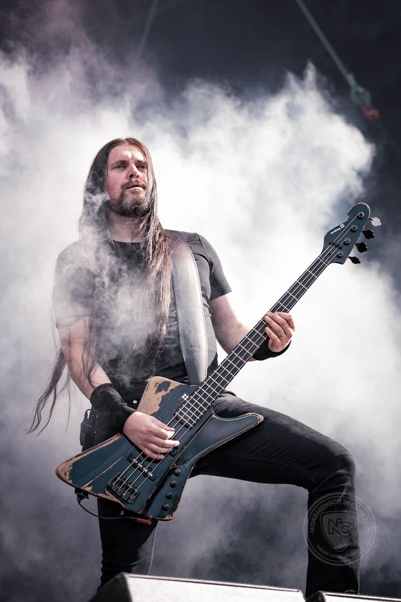 Im Grunde kann man einen ganzen Festivaltag mit Bands der verschiedenen Mitglieder von Cemetery Skyline füllen, und so gibt es nach kurzer Futterpause mit wirklich unfassbar leckerer Pizza ein Wiedersehen mit Gitarrist Markus Vanhala, dieses Mal mit Insomnium. Das Abendprogramm steht im Zeichen des Melodic Death Metal, ein Herzensgenre, und mit Insomnium gibt den Auftakt eine absolute Herzensband dieser Richtung. Der gefüllte Platz vor der Bühne spricht dafür, dass die Band sich auch in ihrer finnischen Heimat nach wie vor großer Beliebtheit erfreut. Insomnium ist auf eine gewisse Art Entspannung pur und mitten im Festivaltag eine schöne Auszeit, in der die wunderschönen Melodien von Songs wie Lilian über das Publikum hinweg spülen. So widersprüchlich das klingt, ist die Performance der Finnen dennoch energiegeladen. Sie lädt ein zum entspannten Härchenschütteln.