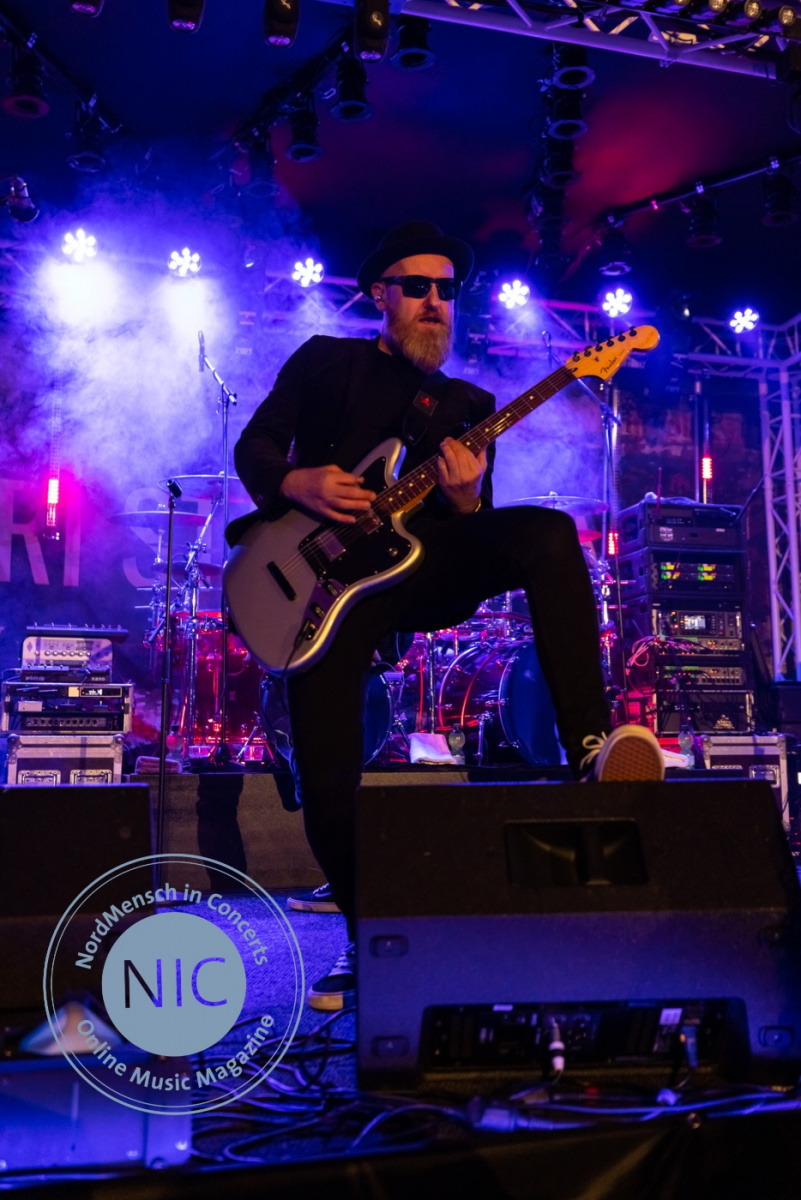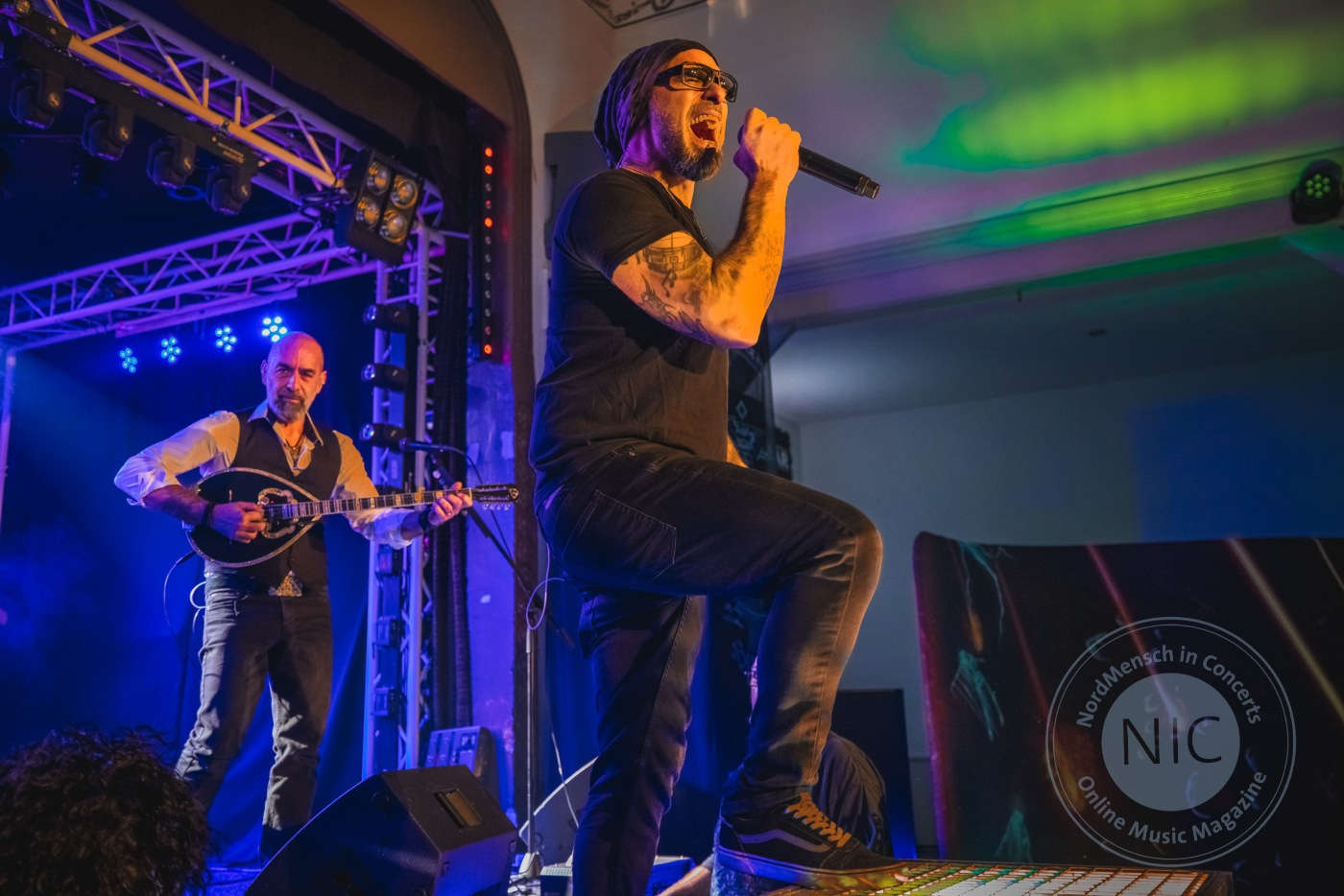 Den Anfang um 19:00 Uhr machen TRI STATE CORNER. Das deutsch-polnisch bzw. griechische Quartett war bereits im vergangenen Jahr im November hier im Hademarscher Hof zusammen mit RAGE aufgetreten. Bei diesem Gig im letzten Herbst hatte die Band bereits auf ganzer Linie gepunktet und eine große norddeutsche Fanbase hinzugewonnen. Gesanglich führt Lucky alias Vassilious Maniatopoulos durch die Alben. Ihn kennt man ja seit 2015 als Drummer von RAGE. An der Bouzouki finden wir seinen Bruder Ioannis „Janni“ Maniatopoulos und an den Drums sitzt wiederum der ehemalige Drummer von RAGE, nämlich Christoph „Efti“ Efthimiadis, der die ersten elf Alben von RAGE musikalisch mit begleitete. An der E-Gitarre haben wir dann zu guter Letzt noch den den Mann mit dem Hut, nämlich Christoph „Brat“ Tkocz. 18 Jahre gibt es diese Band bereits und fünf Alben und eine EP sind in dieser Zeit entstanden. Was sie spielen, nennen sie Bouzouki-Rock. Mit zuvor genannter Bouzouki kommt dann die griechische Folklore-Note der Gebrüder Maniatopoulos in die fetzigen Rocksongs, die aber auch die eine oder andere schöne ruhigere Nummer mit sich bringen. Wir erleben einen grandiosen und lebendigen Auftritt und ein super gutes Warm-Up für alles, was da heute Abend noch kommen sollte. Wer TRI STATE CORNER noch nicht live erlebt hat – bitte schaut sie Euch an. Und Vorsicht: Infizierung folgt und man möchte mehr! Eine tolle Songauswahl für die Setlist, es kam etwas von den älteren Alben, aber auch vom aktuellen Album „Stereotype“, welches im April diesen Jahres erschien. Mir persönlich fehlte „Downfall“, aber es kann ja nicht alles gespielt werden und die Slot-Zeit endete, damit für den ersten Headliner des Abends Platz gemacht werden konnte.