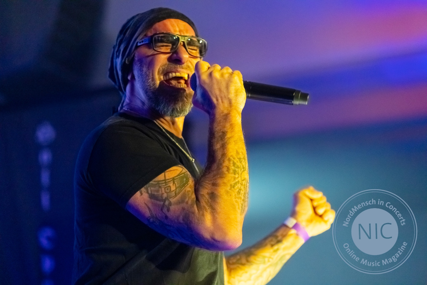 Weiter geht es nach einer zügigen Umbauphase mit RAGE. Schon im Vorwege konnte den Social Media Plattformen der Band entnommen werden, dass Peavy sich während der Tour eine starke Lungenentzündung zugezogen hatte und vier Konzerte nicht mit am Start war. Wir hatten echt befürchtet, Peavy hier nicht live erleben zu können, da kurz zuvor schon in Hamburg der Part von RAGE wegfiel. Aber schon vor der Eingangstür hörten wir von einigen, dass der Boss wieder an Bord ist, jedoch die Stimme noch nicht so will. Nunja, wie sollte das denn nun gleich abgehen? Was wir nun in der kommenden Stunde erlebten war dann einfach für jeden RAGE-Fan eine wundervolle Erinnerung – soviel sei vorweg genommen. Die Musiker nahmen ihre Plätze ein und Peavy wandte sich mit brüchiger Stimme an das Publikum. Er wollte diesen Abend, er wollte es belohnen, dass das Publikum in diesen Zeiten da war und er zollte den Metalheads Respekt für den Zusammenhalt. Es gab Applaus und der sympathische Frontmann nahm seinen Bass und Lucky erklärte kurzerhand, dass jeder aus der Band, als auch noch ein weiterer Gast, heute Abend gesanglich durchs Programm führen werden. Was dann folgte, war ein Klassiker-Song-Set, dargeboten in einer Art „Jam-Session“, die man wohl so in dieser Form nur einmal erleben konnte. Wir sind noch immer dankbar Teil dieses Abends gewesen zu sein. Nun war es an der Zeit, dass Jean und Stefan, die beiden Gitarristen zum zentralen Point wurden und auch Lucky verließ ab und an die Felle, um gesanglich einige Songs mitzusingen. Er leistete heute am Schlagzeug, gesanglich (auch zuvor schon mit Tri State Corner) und als Entertainer zwischen alledem wahnsinnige Arbeit und das in Topform und perfekt unterhaltsam. Respekt sagen wir! Auch Jean hat gezeigt, dass er eine tolle Stimme hat und den Rampensau-Part übernahm heute Abend Stefan Weber. Zufrieden schaute Peavy auf seine Kollegen und genoss sichtlich den Auftritt der etwas anderen Art. „Straight to Hell“ und „Empty Hollow“ besang dann BRAINSTORM-Frontmann Andy B. Franck. Weitere Songs kamen von der Tonspur und das Publikum unterstützte ebenfalls lauthals (das kostete dann auch meine Stimme). Während das Hademarscher Publikum noch „Higher than the Sky“ in Endlosschlaufe sang, bedankten sich die Musiker bei den Besuchern und man konnte vollkommen glücklich die Bühnenbretter verlassen. Auch wir waren vollgefüllt mit Adrenalin und summten uns vor den Eingangsbereich des Hofes und man erzählte sich, wie fantastisch das eben Dargebotene war. Natürlich hat dem Peavy hier keiner eine Lungenentzündung gewünscht, aber das Improvisieren und der kreative Umgang der weiteren Bandmitglieder in solch einer Situation hat für RAGE-Fans, wie wir es sind, einfach Geschichte geschrieben. Wir hoffen an dieser Stelle, dass der Peavy mittlerweile wieder durchgegrünt ist und freuen uns auf noch viele weitere Auftritte der Herner Truppe.