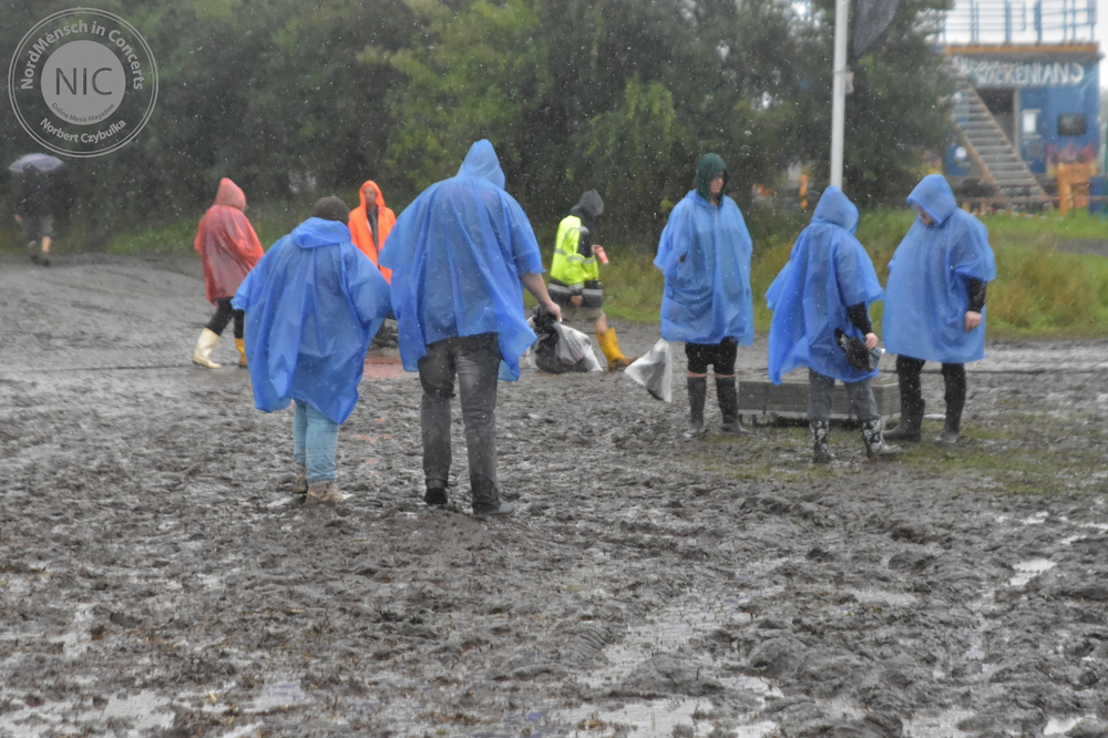Es schüttet weiter. Ein gefühlter Stau bis zum Ende Schleswig-Holsteins lässt die Besucher verzweifeln. Die Festivalbesucher werden seit gestern einzeln auf die Campgrounds gezogen. Die Wege sind nur noch Schlamm und übersäht mit 30 Zentimetern tiefe Treckerspuren. Ich entscheide mich gegen einen Rundgang durch die Camps. Überall sind die Treckerfahrer die Helden und werden nach jedem gezogenem Auto, Wohnmobil oder Anhänger gefeiert. Da muss ich nicht auch noch stören. Es wird von einem Anreisestopp gemunkelt. Ich nehme wieder das Musikprogramm im LGH wahr.