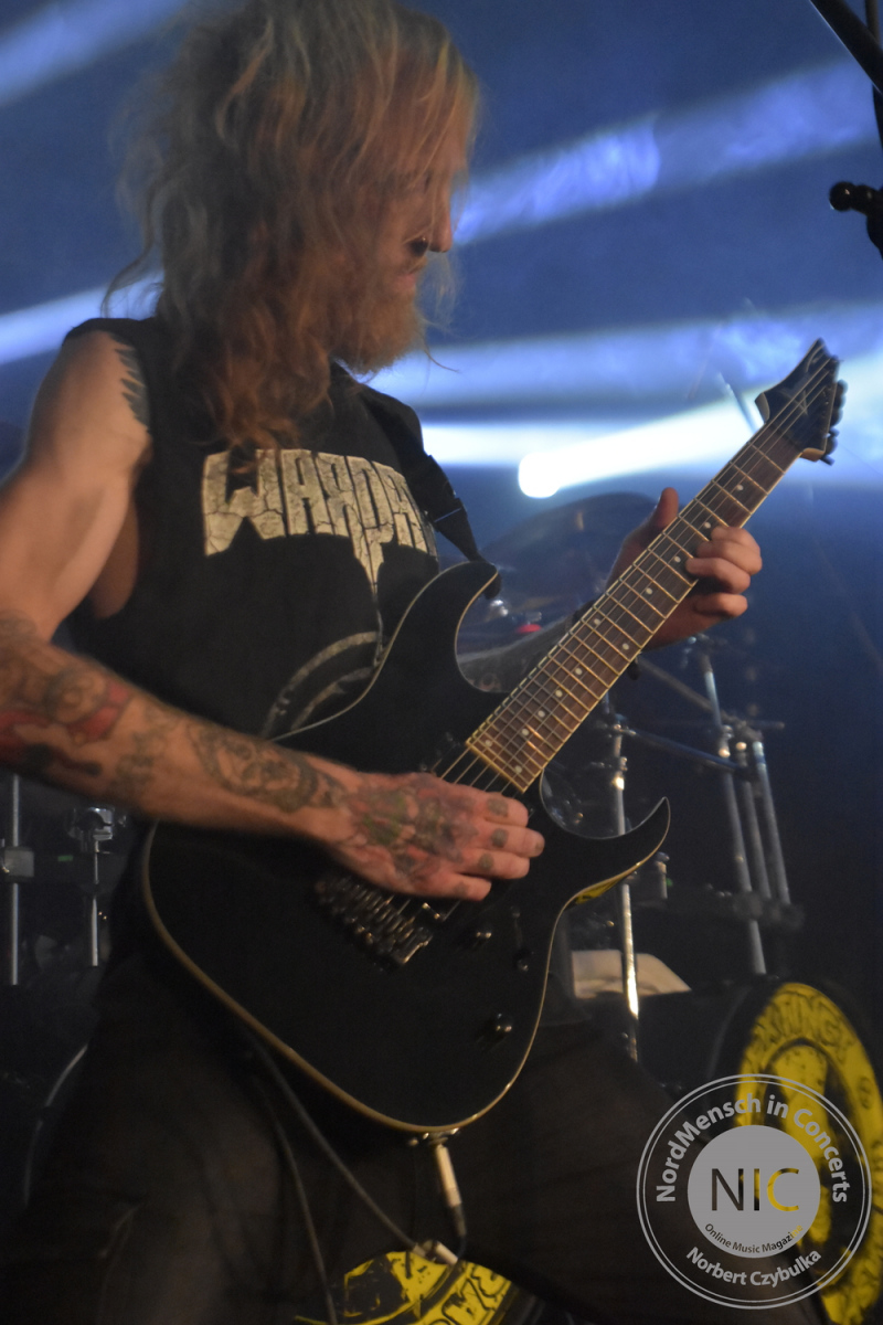 Ich möchte wieder rauf ins Pressezelt, denn Heaven Shall Burn haben sich zu einem lockeren FAQ angekündigt. Wann hat man schon einmal die Chance, den Jungs aus Jena so nahe zu kommen? Das Konzert von Delain werde ich mir Zuhause im Replay bei Magenta Music noch einmal zur Begutachtung anschauen. Hier ist so viel los, das man es einfach nicht einmal annähernd schafft, alles zu sehen. Dennoch schaffe ich es, zu Ensiferum vor der Harder-Stage im Fotograben zu stehen. Schnell Fotos und ab zur (abgesoffenen) Wackinger-Stage. Eigentlich sollten dort die „Beschissenen Sechs“ spielen. Leider hat sich deren Sänger bei Werbeauftritten in der Vorwoche erkältet und sie sagen den Wacken-Auftritt enttäuscht ab. Fans wissen natürlich, das sich hinter diesem Namen Kai Wingenfelder mit Fury in the Slaughterhouse versteckt. Die Hope-Promotour hat Spuren an Kai’s Stimme hinterlassen. Da in der kommenden Woche die dazugehörige Tour startet, möchte die Band verständlicherweise nichts riskieren. Als Ersatz für diesen Slot steht die Hamburger Band Hardbone zur Verfügung, die gestern Abend den Landgasthof abgerissen haben. Ihre 110 Prozent Rock´n´Roll begeistern mich schon seit Jahren. Ich treffe vor der Bühne Bekannte aus Frankfurt, mit denen wir 2011 und 2012 zusammen campten. Danach hetze ich sofort wieder zur Faster-Stage.