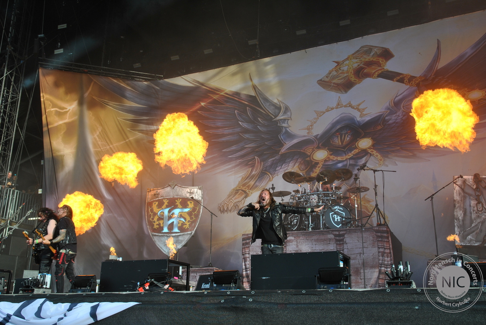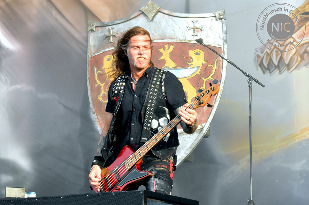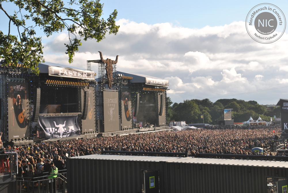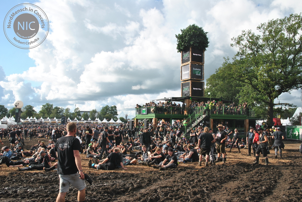 Ich möchte wieder rauf ins Pressezelt, denn Heaven Shall Burn haben sich zu einem lockeren FAQ angekündigt. Wann hat man schon einmal die Chance, den Jungs aus Jena so nahe zu kommen? Das Konzert von Delain werde ich mir Zuhause im Replay bei Magenta Music noch einmal zur Begutachtung anschauen. Hier ist so viel los, das man es einfach nicht einmal annähernd schafft, alles zu sehen. Dennoch schaffe ich es, zu Ensiferum vor der Harder-Stage im Fotograben zu stehen. Schnell Fotos und ab zur (abgesoffenen) Wackinger-Stage. Eigentlich sollten dort die „Beschissenen Sechs“ spielen. Leider hat sich deren Sänger bei Werbeauftritten in der Vorwoche erkältet und sie sagen den Wacken-Auftritt enttäuscht ab. Fans wissen natürlich, das sich hinter diesem Namen Kai Wingenfelder mit Fury in the Slaughterhouse versteckt. Die Hope-Promotour hat Spuren an Kai’s Stimme hinterlassen. Da in der kommenden Woche die dazugehörige Tour startet, möchte die Band verständlicherweise nichts riskieren. Als Ersatz für diesen Slot steht die Hamburger Band Hardbone zur Verfügung, die gestern Abend den Landgasthof abgerissen haben. Ihre 110 Prozent Rock´n´Roll begeistern mich schon seit Jahren. Ich treffe vor der Bühne Bekannte aus Frankfurt, mit denen wir 2011 und 2012 zusammen campten. Danach hetze ich sofort wieder zur Faster-Stage.
