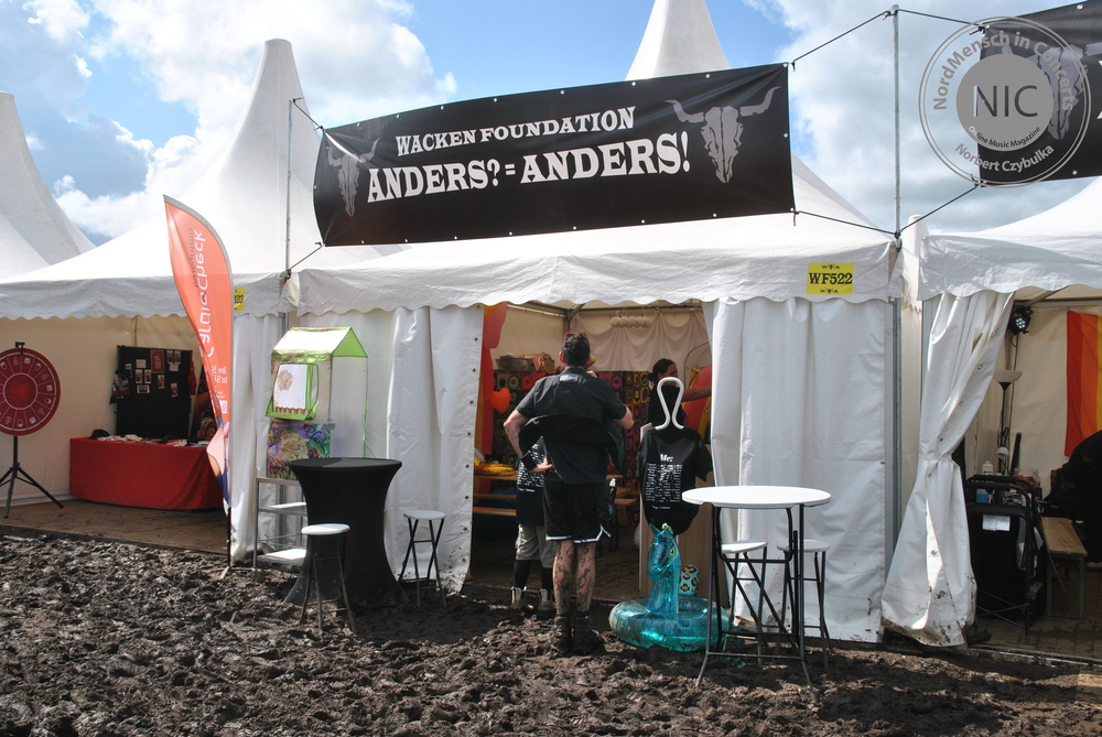 Kurze Verabschiedung und Punkt 08:30 Uhr starte ich den Motor, der nach 88 Kilometer an der Registration in Wacken wieder aus geht. Nach zwei Wochen mit ausgiebigen Regen befürchte ich das Schlimmste und habe wohl wissentlich etwas mehr eingepackt. Derzeit ist alles trocken. Ohne Probleme bekomme ich nach nur kurzer Wartezeit mein Bändchen und mache mich auf zu dem mir zugewiesenen Campground. Ich bin zwei Stunden zu früh, der Platz ist noch nicht offen. Die Zufahrt ist schon jetzt nicht mehr befahrbar und man wartet auf Abdeckplatten. So werde ich „zwischengeparkt“ und strande auf einem falschen Campground. Es beginnt wieder zu regnen. Nach einer weiteren Stunde komme ich weder auf meinen mir zugewiesenen Platz, noch komme ich von dem falschen Platz wieder herunter. Kurze Bestechung von dort schon aufgebauten Camps mit einem Frühstücksbier und ich darf mich auf dem falschen Campground breit machen. Klaufix-Anhänger in eine Lücke ziehen, Kombi Rücken an Rücken, Pavillon darüber – fertig. Ich stelle meinen Stuhl unter den Pavillion und der Starkregen setzt ein. „OK, das kann ja heiter werden“ denke ich mir.
