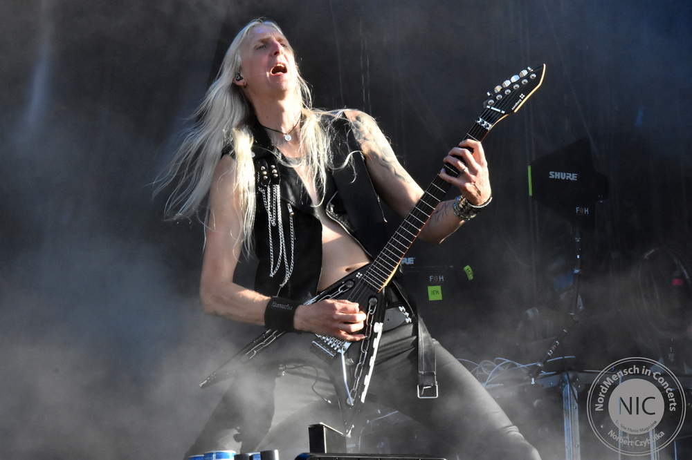 Zusammen mit sechs Wasteland Warriors als Leibwächter betritt sie unter Beifall das Zelt. Sieben Songs bekommen wir auf die Ohren. Sie posted gekonnt in jede Kamera, die sie erblicken kann und gibt Infos zur neuen Platte preis. Ich verpasse meinen Fotograbeneinsatz bei Amaranthe und höre mir das Konzert aus der Entfernung an.
