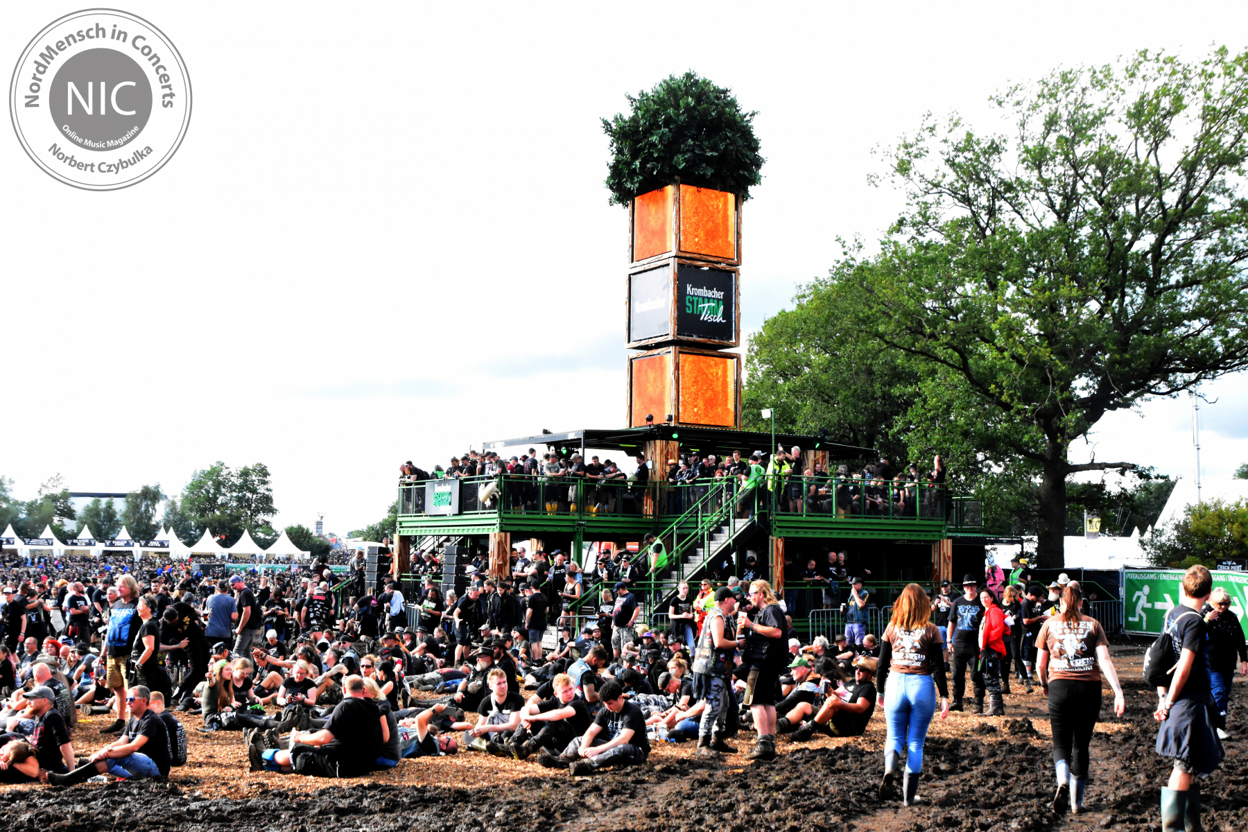 Es hat aufgehört zu regnen und es wird wärmer. Der Entwässerungsgraben hinter meinem Platz ist randvoll und bis auf fünf Zentimeter an das Nachbarzelt herangekommen. Der leichte Wind beginnt die Felder abzutrocknen. Die ganze Nacht waren die Trecker im Dauereinsatz. Ich bin auf Y-Süd zum Frühstück eingeladen und bekomme die Auswirkungen des Anreisestopps mit. Weite Teile sind verwaist, die gemieteten Parzellen leer. Am Infostand steht der weiche Schlamm in der Kuhle knietief. Die Kieler Shanty-Rock Band Wolf Barsch ist kurzfristig gebucht und spielt im Landgasthof. Gitarrist Arne schnappt sich sein Equipment und wir machen uns gemeinsam auf den Weg. An einen Shuttle ist nicht zu denken. Die Hauptstraße nach Gribbom und weiter nach Wacken – Kilometer über Kilometer. Aber immerhin auf festem Boden und nicht mehr im Schlamm. Am Busbahnhof in Wacken trennen wir uns. An der Bandausgabe ist Betrieb. Ich spreche mit Mitarbeitern, die ich im letzten Jahr kennenlernen durfte. Es wird jeder auf das Festival gelassen, der nicht mit dem Auto angereist ist. An mir vorbei holen sich Brasilianer und Equadorianer ihre Bändchen, schnappen sich ihre Sachen und machen sich auf in ihr World-Camp. Ich versuche diagonal über das Gelände zu kommen, scheitere aber.