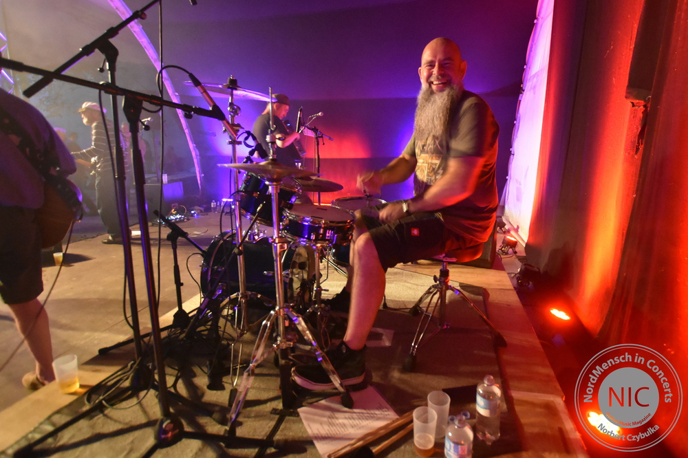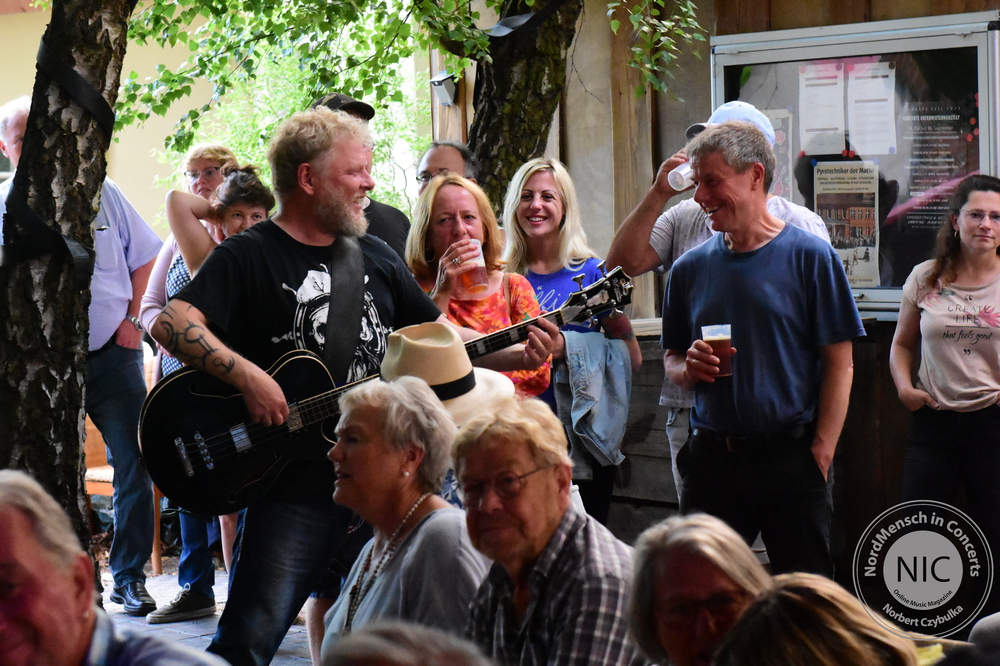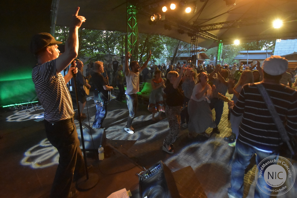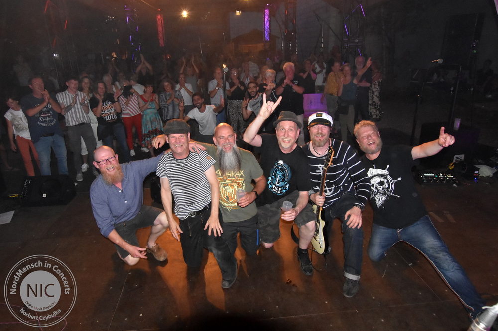 Das Programm beginnt zum Warmwerden mit Bekanntem, dann „Bekannt und geklaut“ bevor es dann mit eigenen Songs weiter geht. Noch sind vereinzelt Sitzplätze frei, das ändert sich aber schnell. Zur Pause nach 60 Minuten ist es recht voll geworden. Umso dunkler es wird, umso mehr geht der Segeberger aus dem Haus. Es ist warm und die modernen Rockshantys gehen ins Bein. Mittlerweile sitzt kaum noch jemand und auch die Tanzfläche vor der Bühne füllt sich endlich. Etwa 300 Gäste kommen in den Genuss des heutigen Abends. Den Zugabeblock gibt es direkt nach dem regulären Programm. Keiner aus der Band möchte in den gefühlt 34 Grad warmen Backstage-Raum – verständlich.
